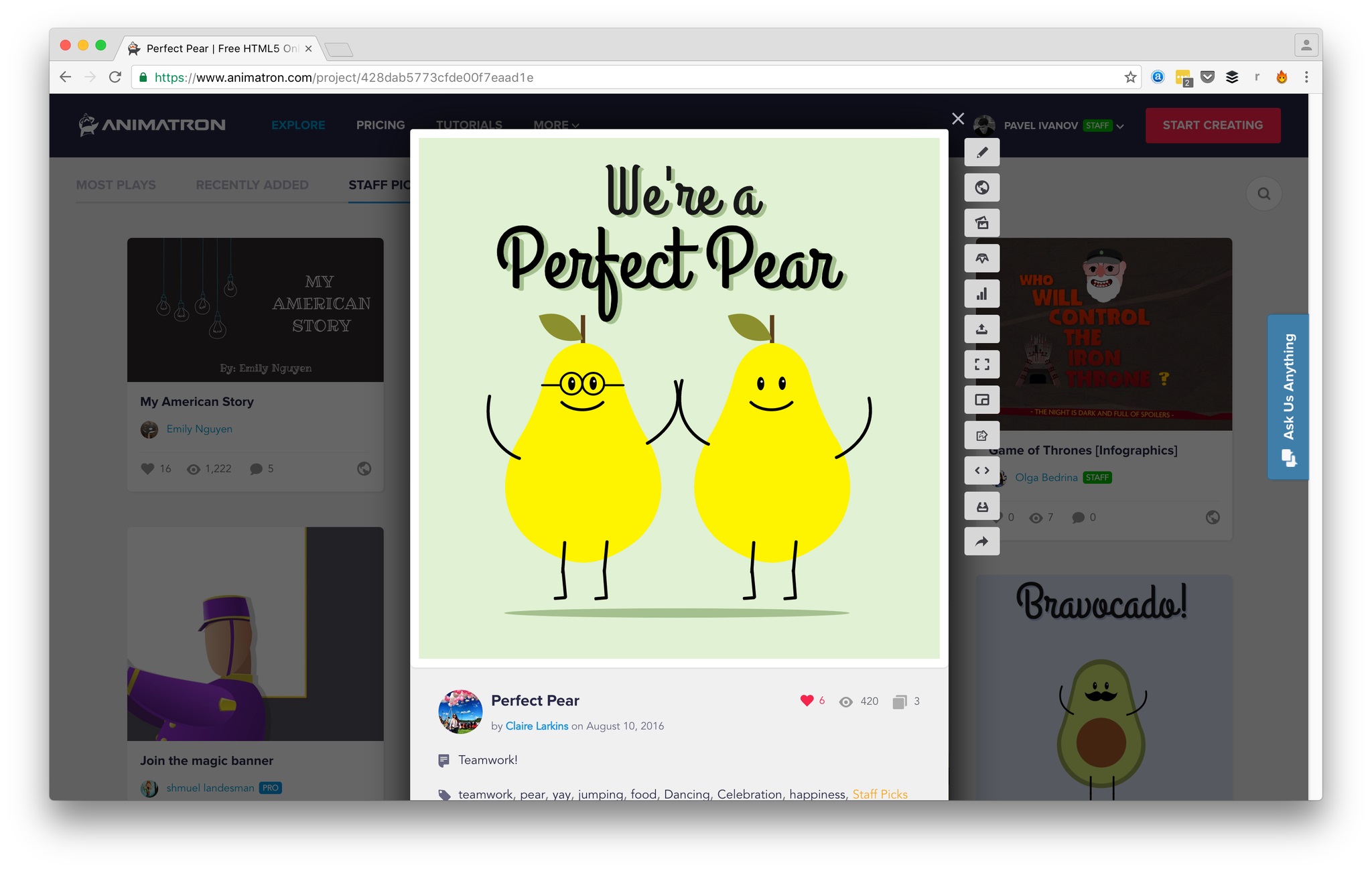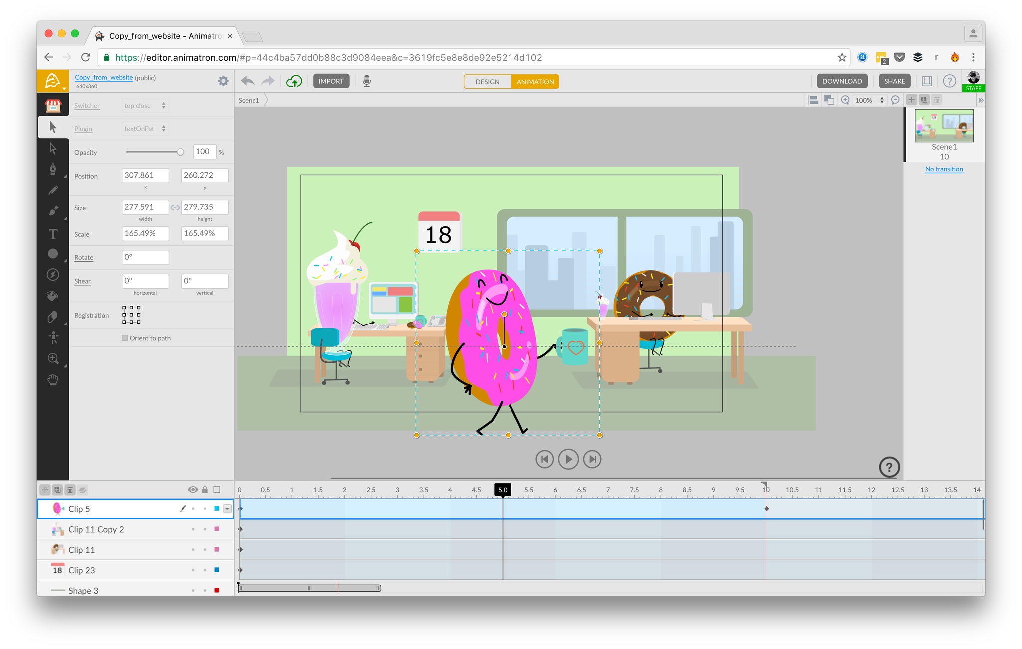 Animatron is an Online Animated Video Maker platform that enables users to create stunning animations and videos right in the browser, built on HTML5 technology which allows for the universal playback on desktop computers and mobile devices.