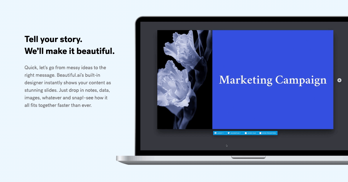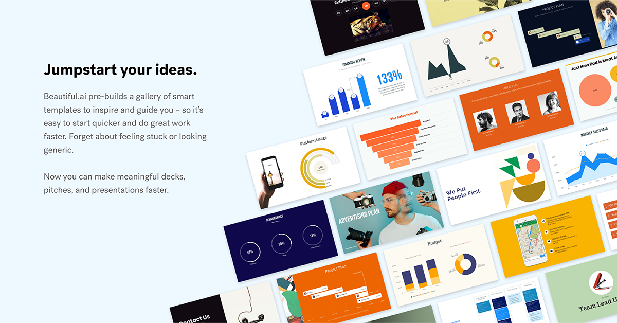 Beautiful.ai is presentation software that makes it easy to turn your ideas into beautiful visual stories.