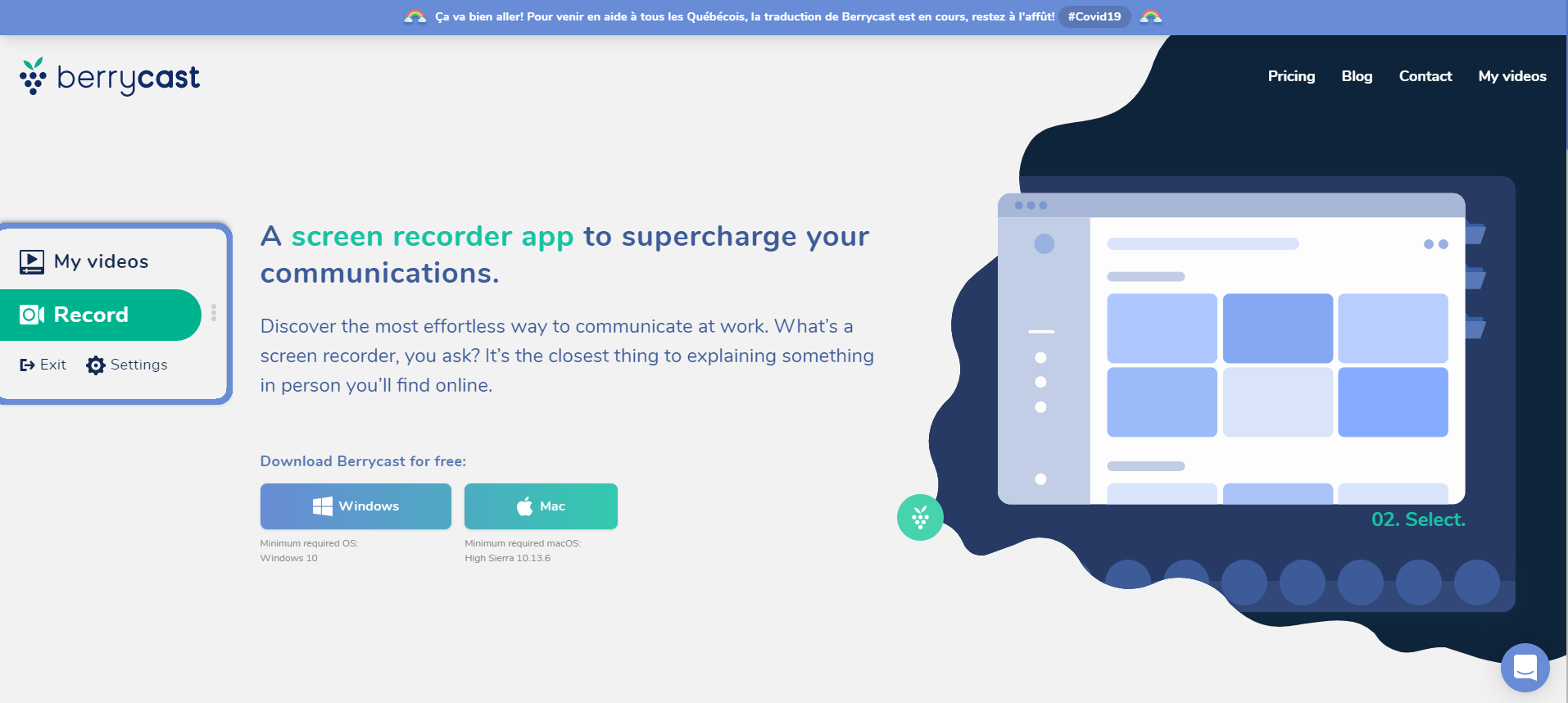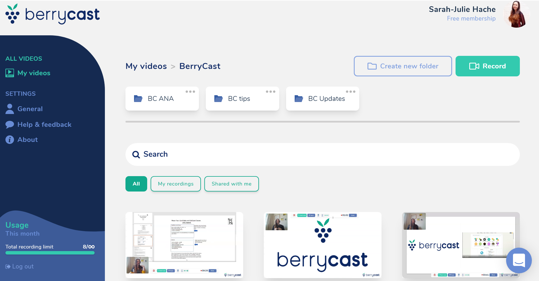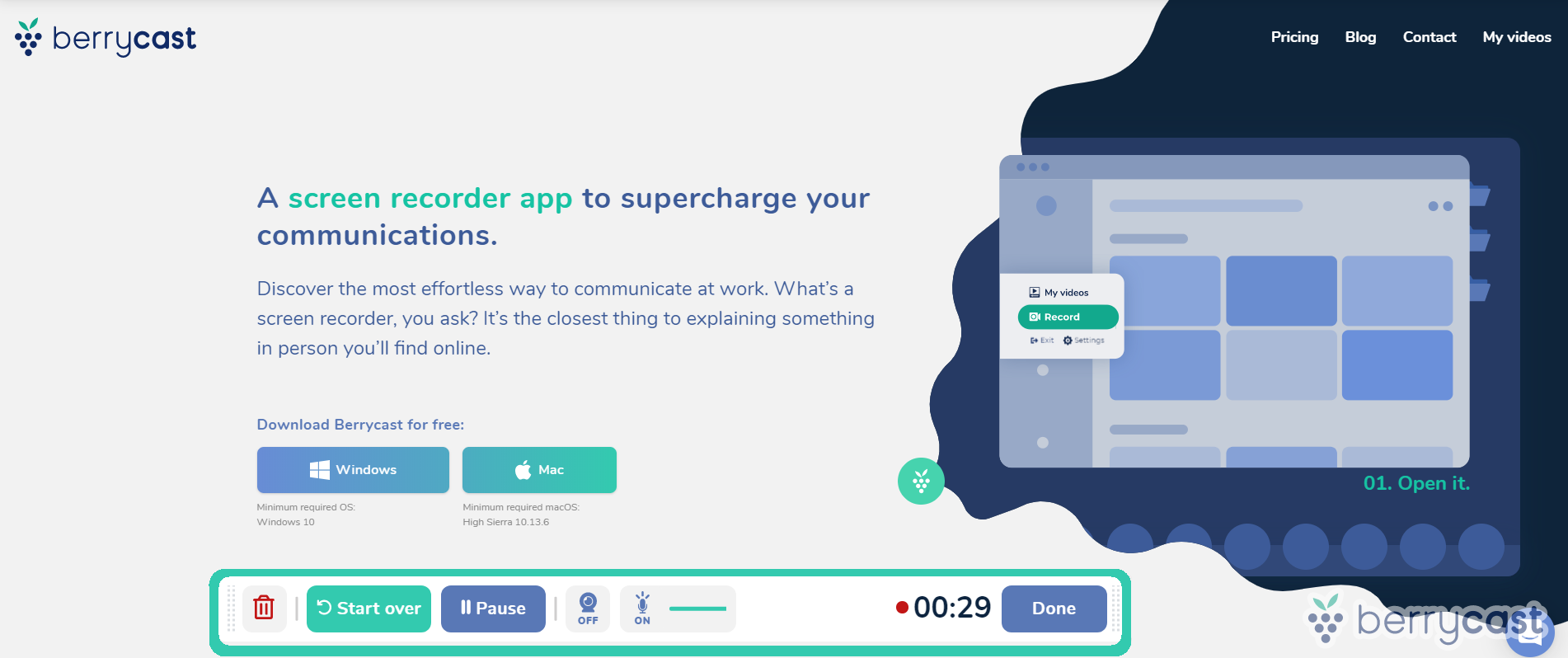 A screen recorder app to supercharge your communications! Discover the most effortless way to communicate at work. Whatâs a screen recorder, you ask? Itâs the closest thing to explaining something in person youâll find online. Berrycast is the easiest tool for screencasting. Everybody can use it in just one click! Flawless onboarding, quick recording widget to your computer, share on any platform, protect your content with a password, have access to all your videos and create a folder to improve your video organization.