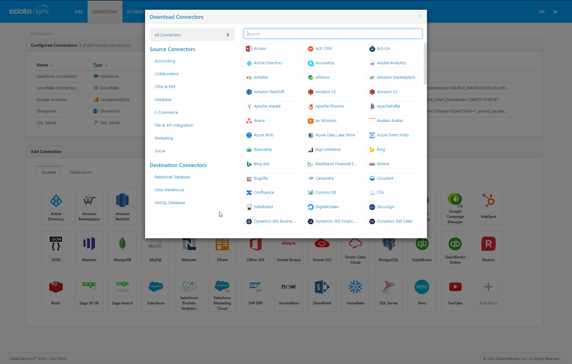 CData Sync is a universal data pipeline that delivers automated continuous replication between hundreds of SaaS applications & cloud data sources and any database & data warehouse of consequence, on-premise or in the cloud.