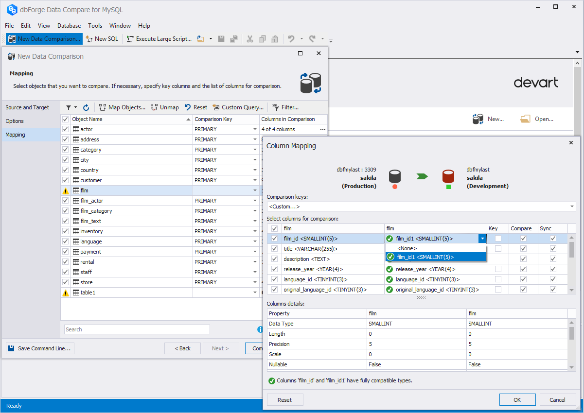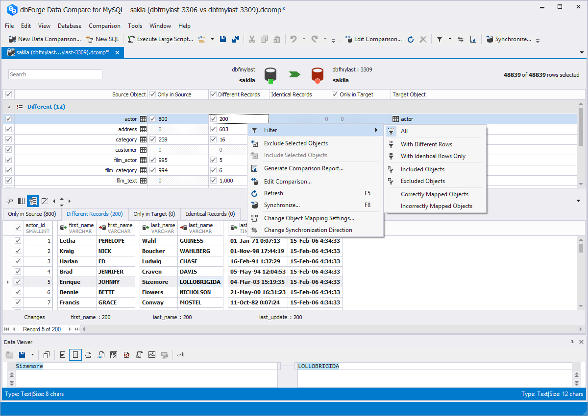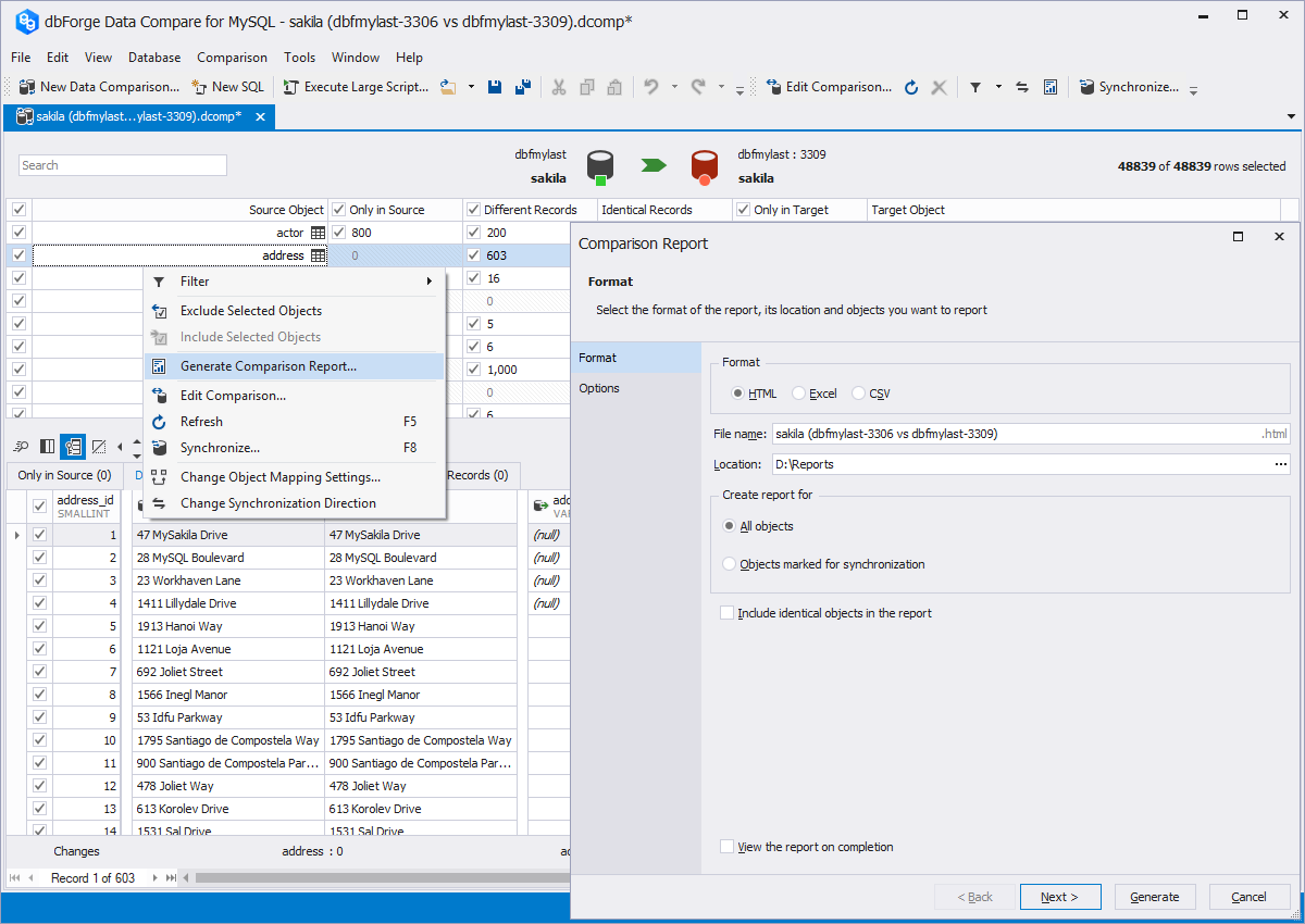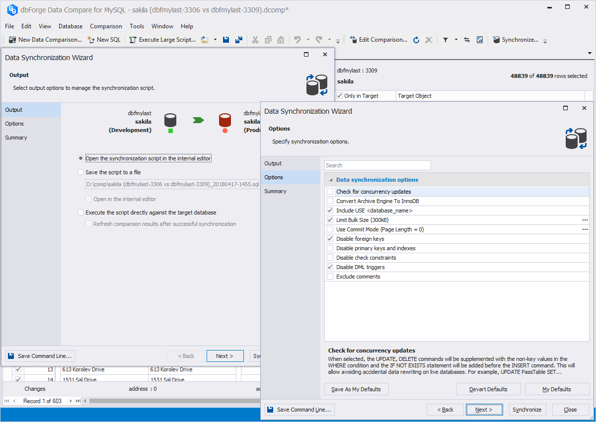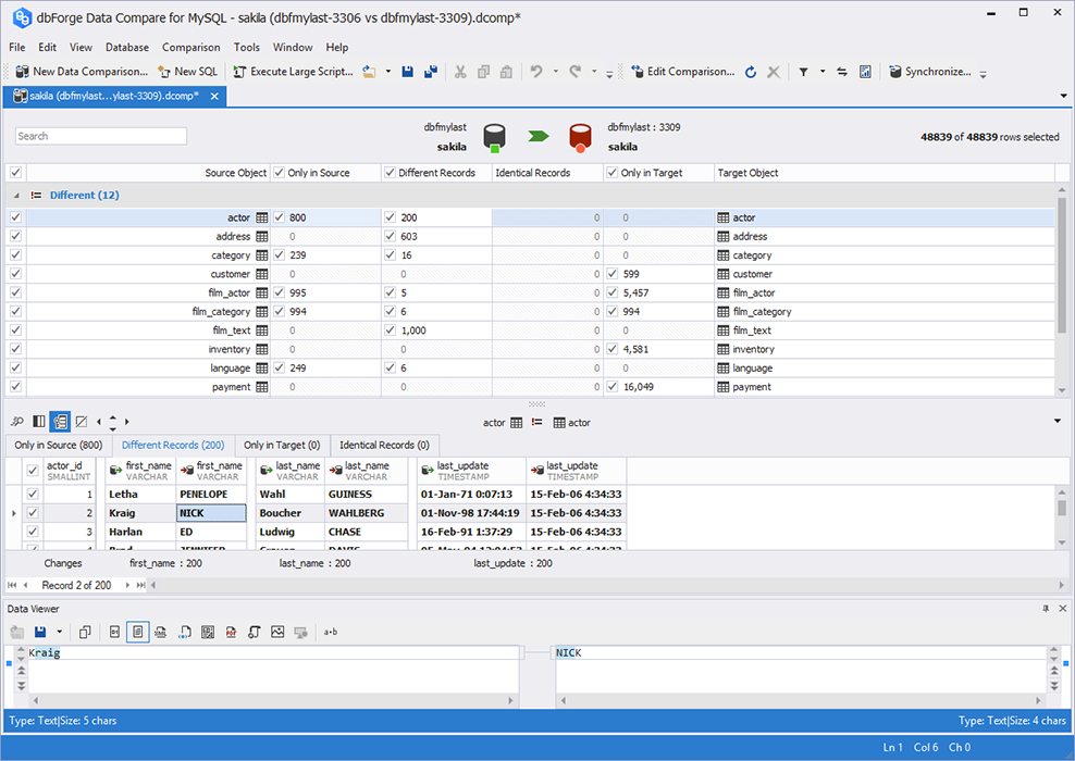 dbForge Data Compare for MySQL serves for comparing and synchronizing data in MySQL, Percona, and MariaDB databases. The tool gives clear view of differences between data, allows analyzing them, generates synchronization script, and applies changes at a glance. It also allows scheduling regular MySQL data comparisons using command line.