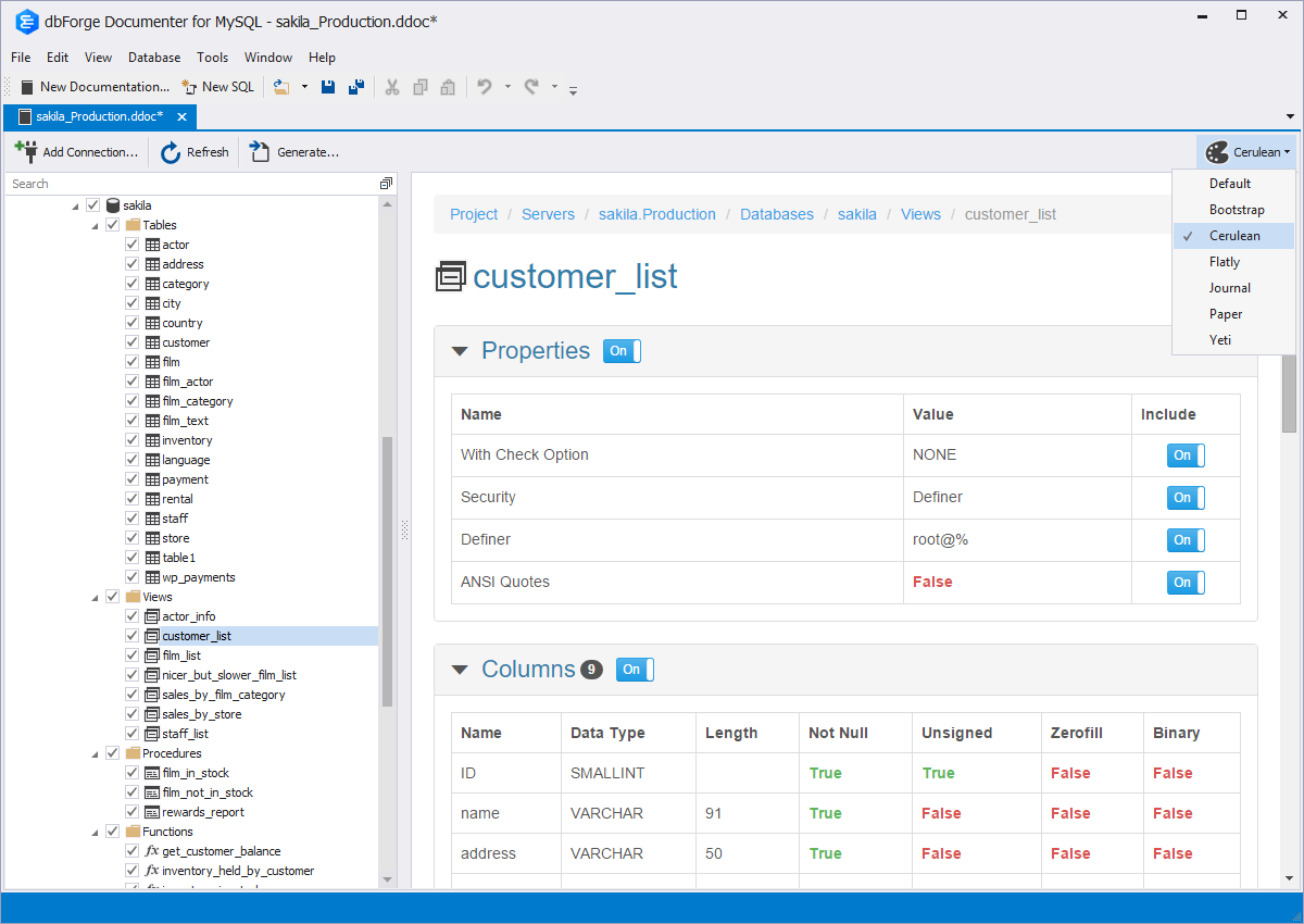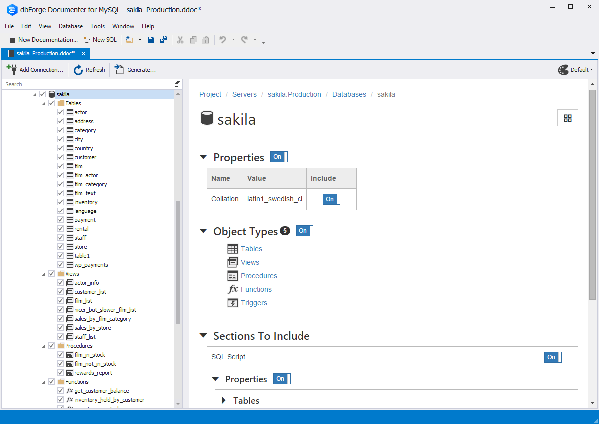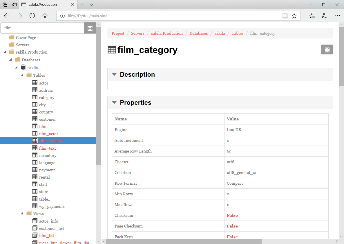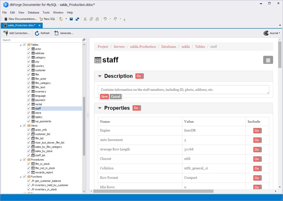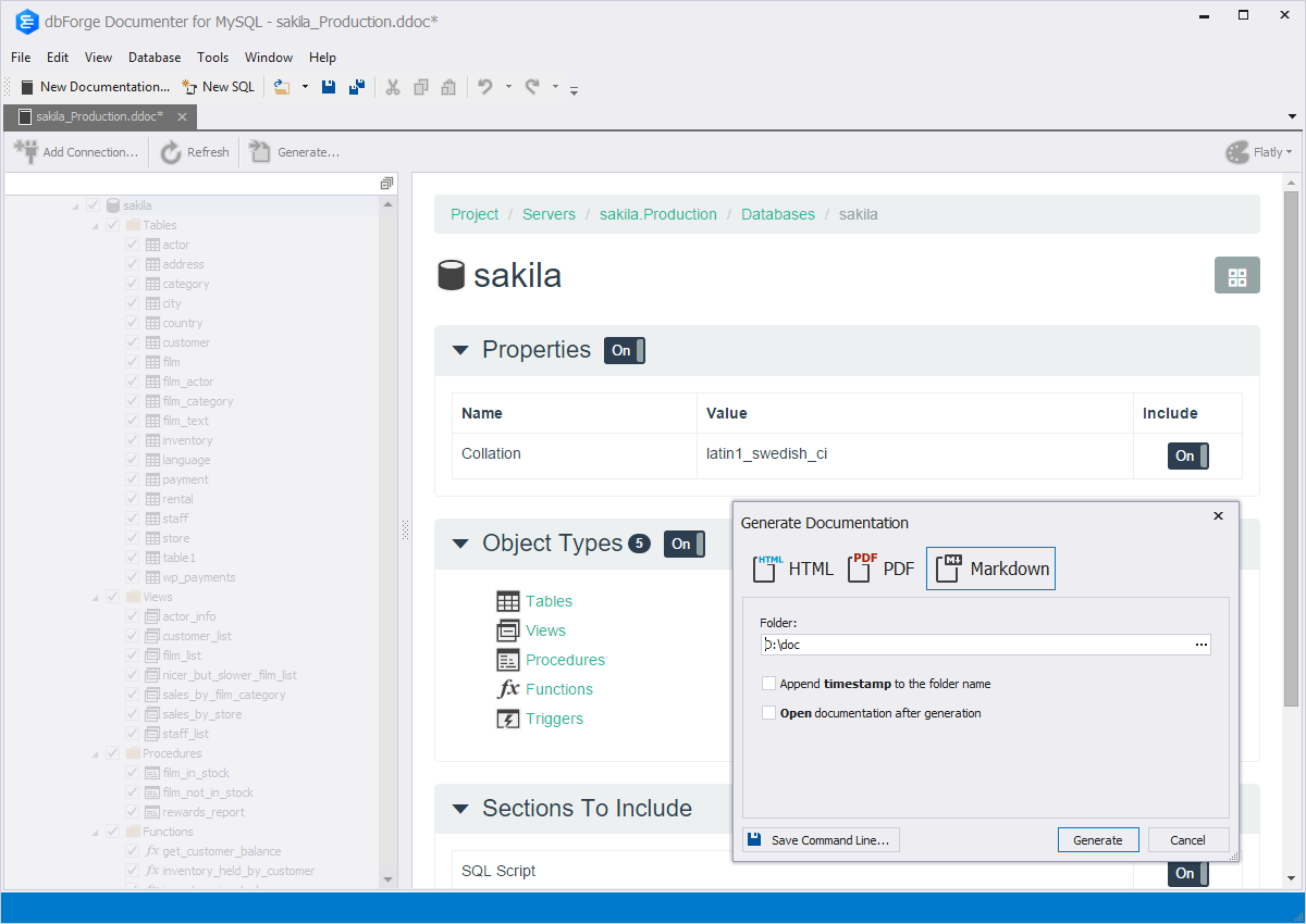 dbForge Documenter for MySQL is a handy MySQL and MariaDB documentation tool that automatically generates documentation of an entire MySQL database in HTML, PDF, and MARKDOWN file formats. The tool allows users to customize the generated documentation up to their needs with help of a bunch of options and settings.
