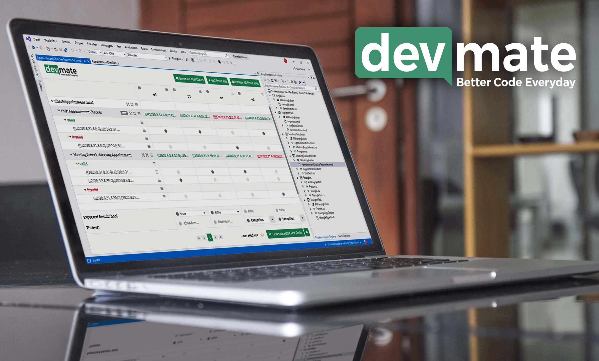 devmate is an easy to use test code generation tool for developers. With our model editor, developers can focus on requirements, inputs and expected outputs. The automatically generated test code is well structured, readable and state of the art test code of the target testing framework. devmate uses black box testing techniques (most competitors only use white box techniques). devmate gives developer fast feedback to recognize lacks and debts in code and makes refactoring easy and safe. Modeling test cases becomes very easy because devmate has AI-powered recommendation systems which fully supports developers at their work and saves them time and money. Team efficiency is highly improved by automated generated unit tests with devmate. It is easy to find bugs in early stages which lowers development costs dramatically. Good unit tests result in substantially increased product quality. Our solution is 100% based on international acknowledged ISTQB-Standards. devmate especially supports Junior Developers by delivering high quality unit tests and avoid expenisve bugs. Because of devmate, the team can focus on new features and core work, which results in 20% more development efficiency according to existing customers. Unlike competitors, devmate integrates seamlessly into the developers environment and is ready for use within 15 minutes. First pilot customers have proven that savings of up to 20,000 Euros per developer per year are possible.