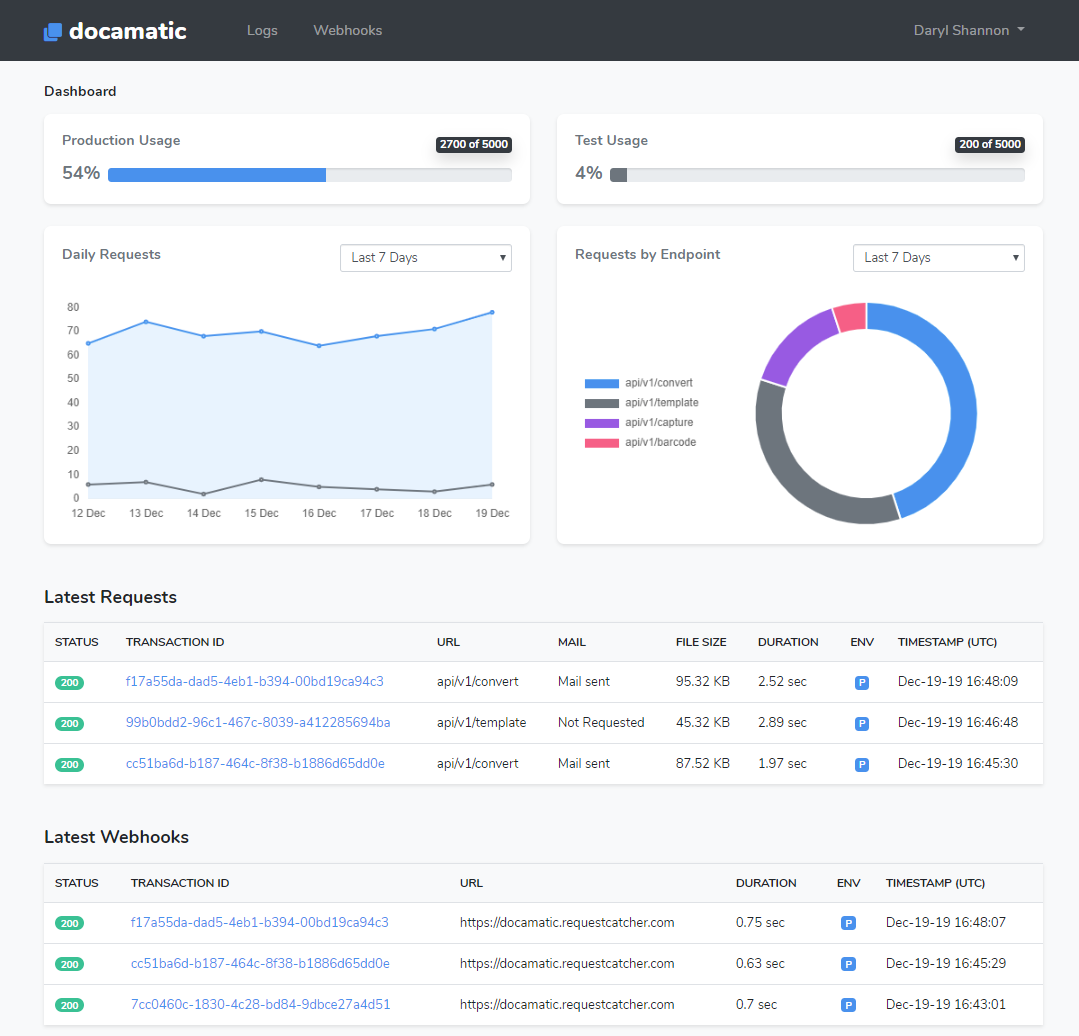 Docamatic is a high quality API that allows you to convert HTML to PDF, create documents from templates (JSON to PDF), capture screenshots and generate barcodes. Create and send your documents via email from a single API call. Keep track of everything from a beautiful, user friendly dashboard. Our ready to go templates for invoices, shipping labels, packing slips and more will have you up and running in no time.