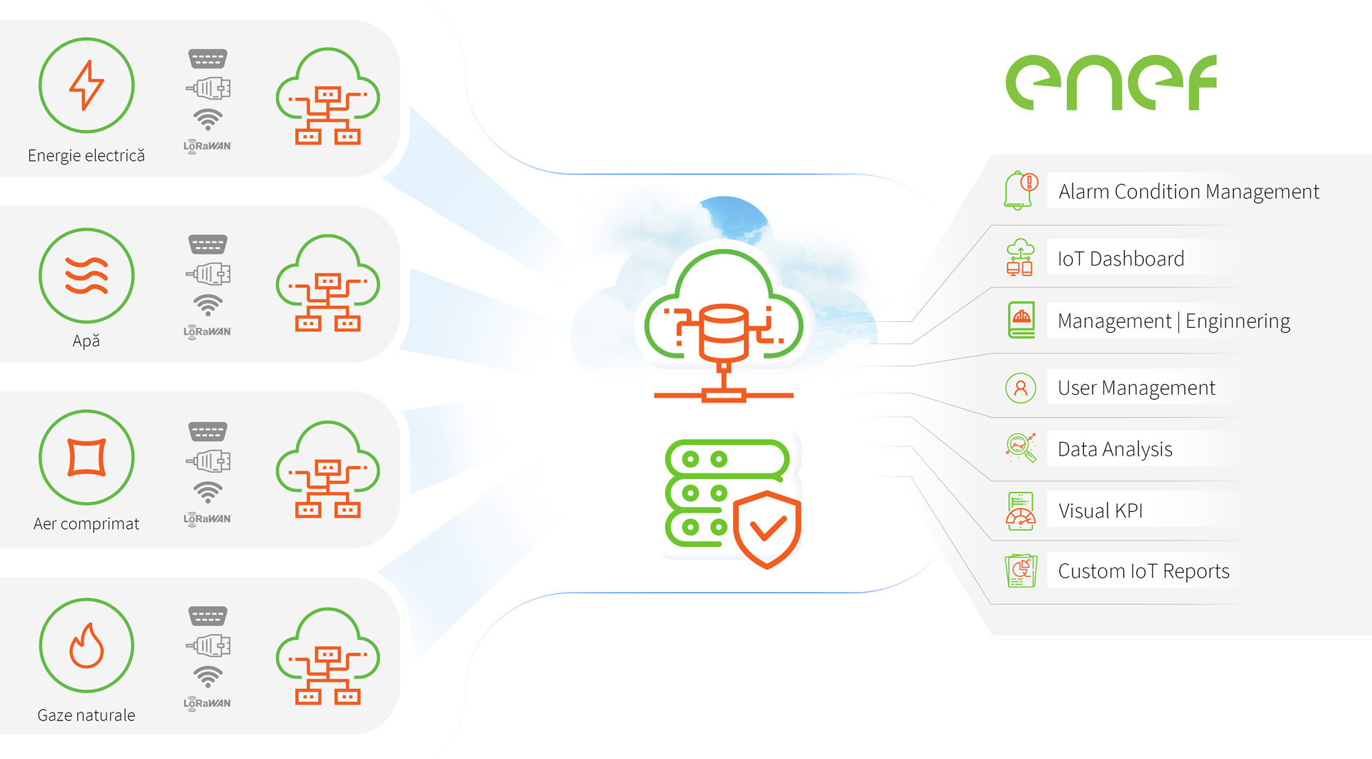 ENEF Energy management system By using ENEF (Energy Efficiency) system you will get operational energy efficiency through monitoring energy consumption, tracking settled consumption budgets and fast identification of areas of high consumption. ENEF system is an essential instrument for monitoring electricity consumption and assuring a performant energy management. Real time monitoring solution for: - Electricity - Compressed air - Natural gas - Water - Thermal energy Using the energy management system ENEF: - Real time consumption - Monitor energy and utilities consumption on each production stage to be able to analyze and optimize consumption and eliminate waste. - Reports for in depth analyses - Reports and charts on quality parameters and consumption recorded in different periods of time. - Technological parameters always in sight - Retrieves any production parameter from smart machinery or from sensors mounted especially for this. - Alerts and notifications - E-mail or SMS alerting on parameters exceeding the normality level and on excessive consumption. - Energy efficiency - Evaluate the equipment energy efficiency, the energy parameters evolution, operation time and malfunction. Benefits: Reliability increase and maintenance cost reduction: ⢠Analysis of distribution and energy consumption quality ⢠Analysis of damage incidents ⢠Major machine faults prevention by monitoring consumption parameters and preventive maintenance Consumption reduction: ⢠Tracking specific consumption by location and area, local accountability and central monitoring ⢠Energy consumption reduction through measures resulted from analysis and reports ⢠Elimination of unnecessary consumption and strengthening of discipline of use ⢠Correct equilibration and correlation of consumed energy types Cost reduction ⢠Optimal selection of energy contract type ⢠Consumption abidance by budgeted values ⢠Precise consumption forecasting Competitiveness increase ⢠Exact cost and energy intensity calculation by locations ⢠Streamlining use of energy and utilities resources Addressability Management ⢠Optimal selection of energy suppliers ⢠Consumption forecasting ⢠Energy budgeting of cost centers and activities ⢠Selection base for consumption reduction energy technologies input areas ⢠Tool for evaluating the efficiency of reduction actions ⢠Tool for raising resource usage discipline and awareness of environmental efforts Technical ⢠Tracking consumption and distribution parameters, agent and distribution quality ⢠Elimination of internal distribution wastage and inefficient use ⢠Damage prevention and incident analysis Commercial ⢠Energy intensity calculation by locations or areas ⢠Allocating costs on cost centers ⢠Precise operational costs calculation The monitoring system is capable of monitoring several hundred or thousands of electrical and non-electrical analog quantities and ensures the performance of reading the energy parameters at an interval of at least one second and reading the process state parameters at a minimum of 5 seconds. We integrate a wide range of sensors, transducers, PLCs, process equipment from different manufacturers.