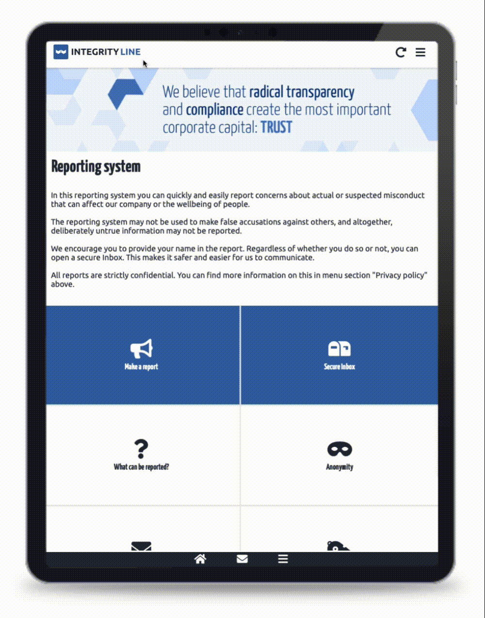 EQS Integrity Line is Europeâs most trusted digital whistleblowing system. With multiple reporting channels and intuitive case management, the system easily adapts to clientsâ requirements; whether introducing a confidential whistleblowing channel for the first time or having well-established, global policies and procedures. With 24/7 reporting in any language via phone, web, email and open door, EQS Integrity Line makes it easy for the reporter. Itâs used worldwide and in over 70 languages. Intuitive case management ensures that clients can manage incoming reports and end-to-end investigations efficiently and collaboratively, while maintaining confidentiality. Real-time dashboards make internal reporting and trend analysis simple. Our expert team works to ensure that our clients have the right set-up for their organisation, making the implementation of EQS Integrity Line seamless.