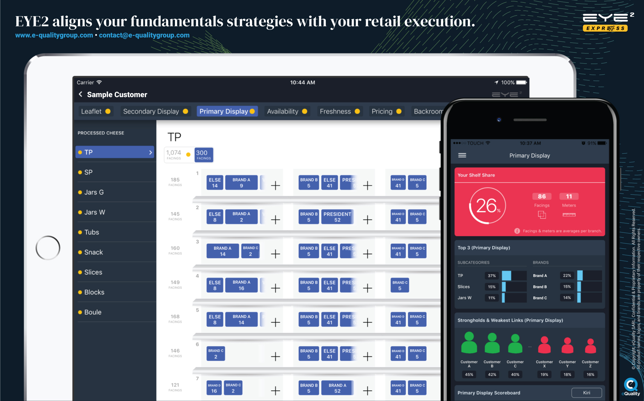 EYE2 is a digital solution for FMCG/CPG suppliers and distributors to align their fundamentals strategies with their retail execution. Trusted by multinationals in 12 countries to date, EYE2âs fully-localized capabilities and its referenceable multi-lingual support team address user resistance to change and cultural barriers. EYE2 boasts a comprehensive set of KPIs for full visibility and control at each point of sale, including on Primary Display, Secondary Display, Availability, Pricing, Freshness, Ageing, Backroom, Leaflet, and more. EYE2 compares your performance against both competition and targets across all KPIs. This empowers you with KPI-driven dashboards to immediately identify actionable insights for retail execution excellence.
