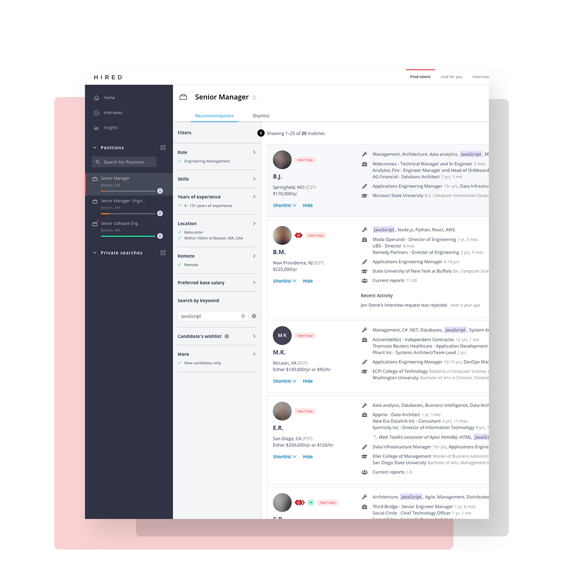 Hired is the first two-sided marketplace created specifically for engineers, data scientists, designers and product managers who are overwhelmed with job opportunities.