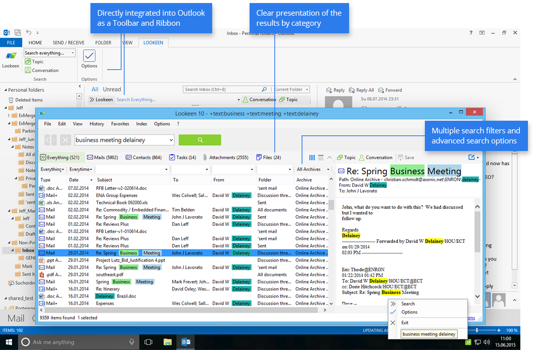 - Outlook Integration: Lookeen seamlessly integrates with Microsoft Outlook, providing users with lightning-fast search capabilities within their email client. This integration is a true time-saver, as it allows quick and efficient email retrieval, even from massive mailboxes.