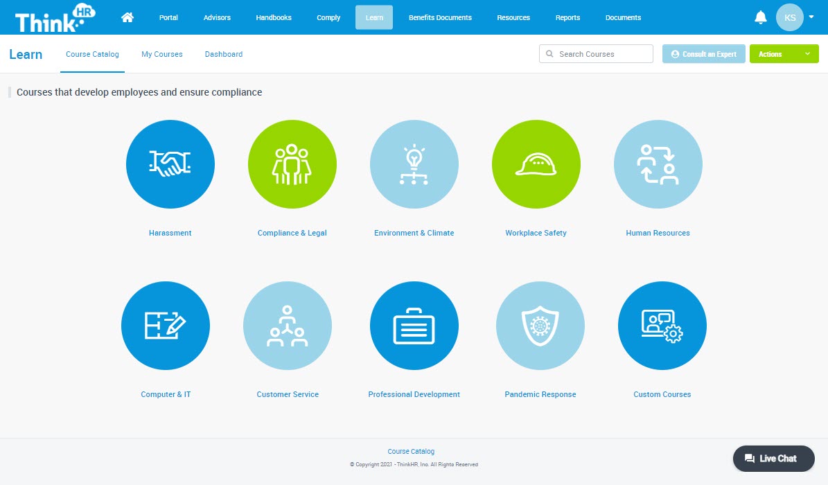 ThinkHR delivers the courses and solutions that matter most to organizations, helping them stay compliant and empowering employees with the information and tools to grow professionally. ThinkHR Learn is different from other training solutions with its bite-sized courses, unlimited access, private branded approach and custom administration.