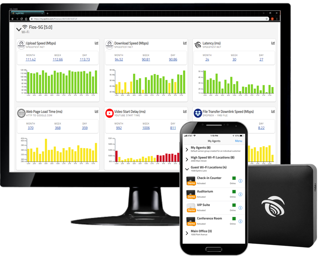 myEPITIRO continuously tests, reports, and notifies you of your Wi-Fi user-experience.If providing Wi-Fi to your customer is critical to your business, myEPITIRO makes it simple to verify expected service levels (SLA), be notified of outages and performance degradations and share information with stakeholders.myEPITIRO helps Network Service Providers spot customer experience problems, network capacity limitations, user authentication failures, and signal interference issues.