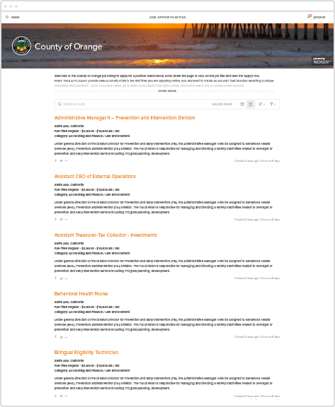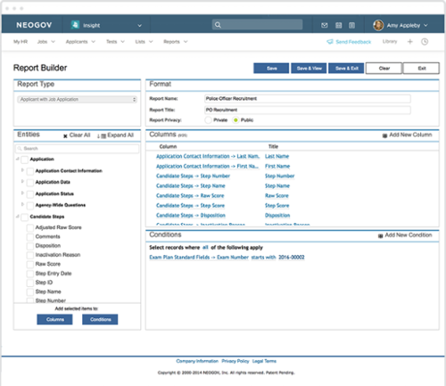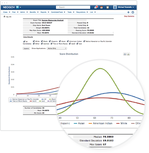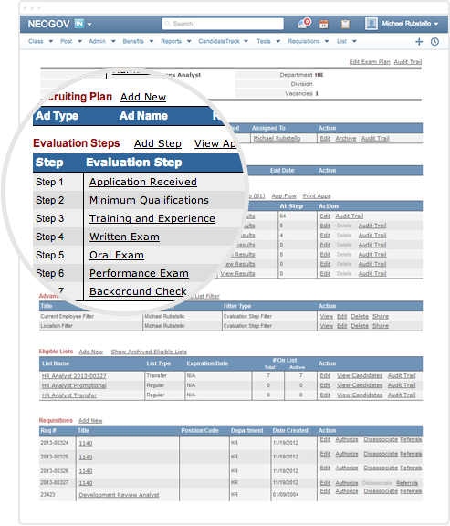 NEOGOV HR software automates the entire hiring and performance evaluation process, including position requisition approval, automatic minimum qualification screening, test statistics and analysis, and EEO reporting.
