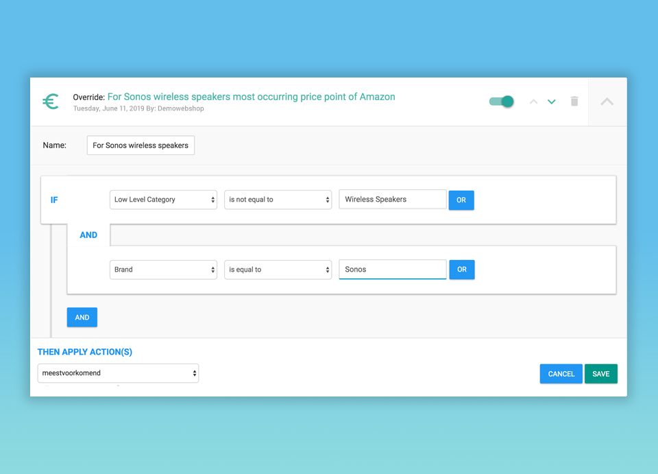 Omnia's Dynamic Pricing is pricing optimization software based on price elasticity of products through an intelligent core algorithm. This algorithm incorporates data from your internal systems (e.g. product and sales data) with other data sources (e.g. Google Analytics), to generate new, optimal prices for you, without you having to lift a finger.