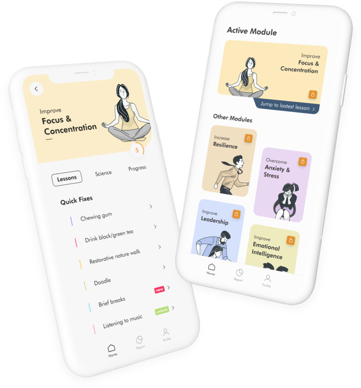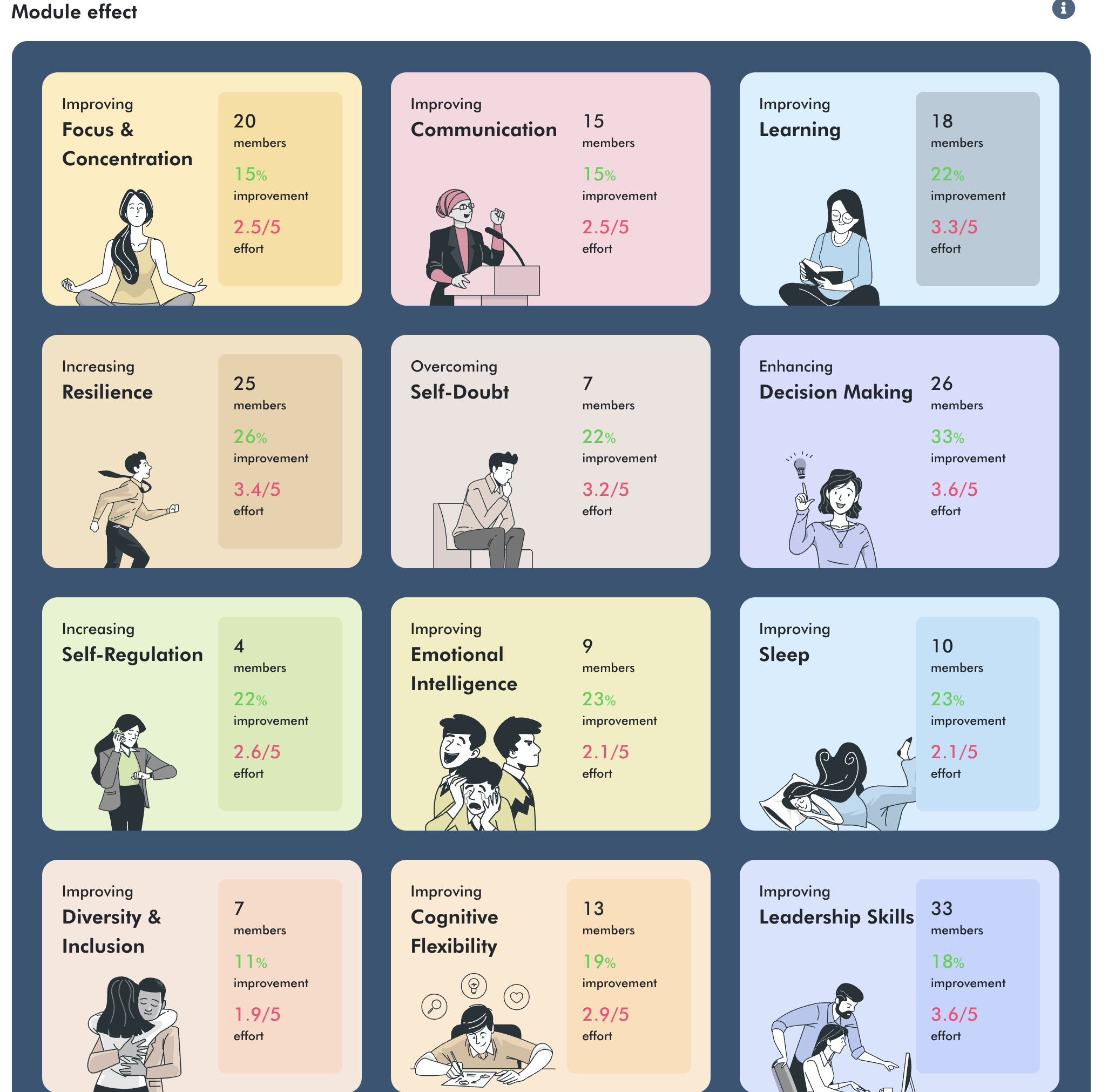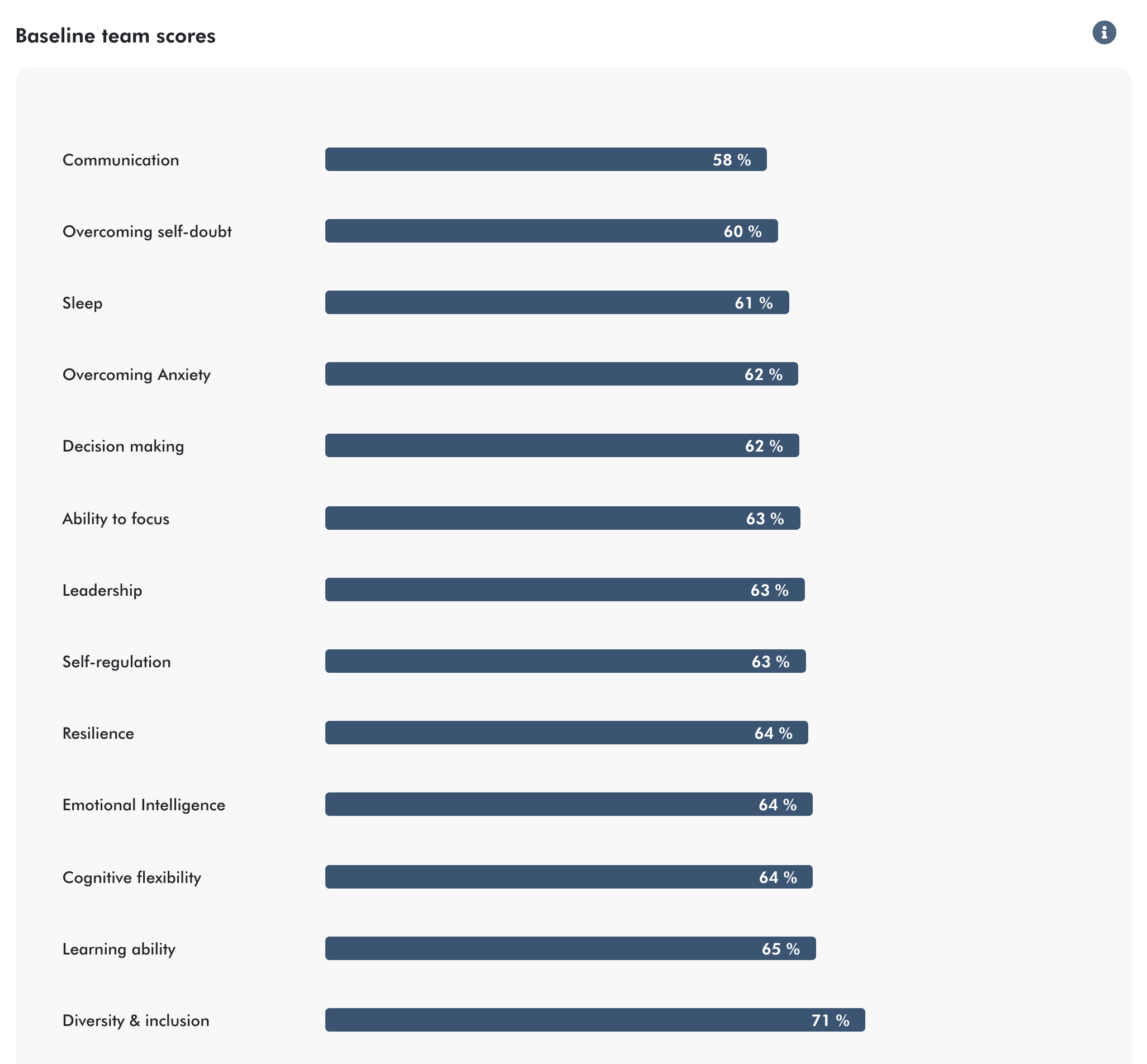 Offer your employees a cognition coach in their pockets and help them reach their peak mental performance. As an employer have access to dashboards that reflect the cognitive aptitude of your employees, their level of engagement with our cognition coach and see their real-time improvements. See these in aggregate form and never divulge an employee's privacy.
