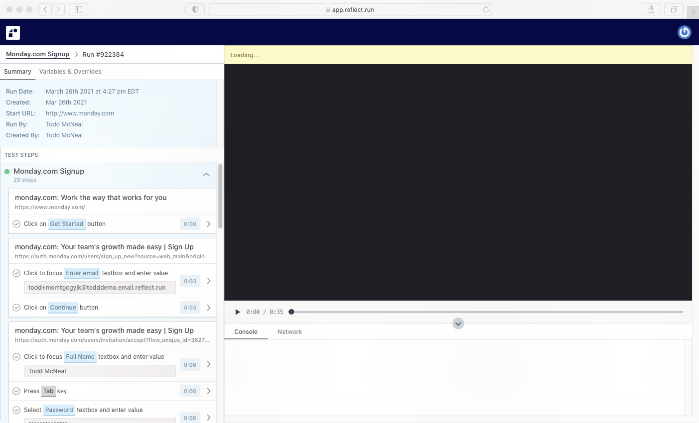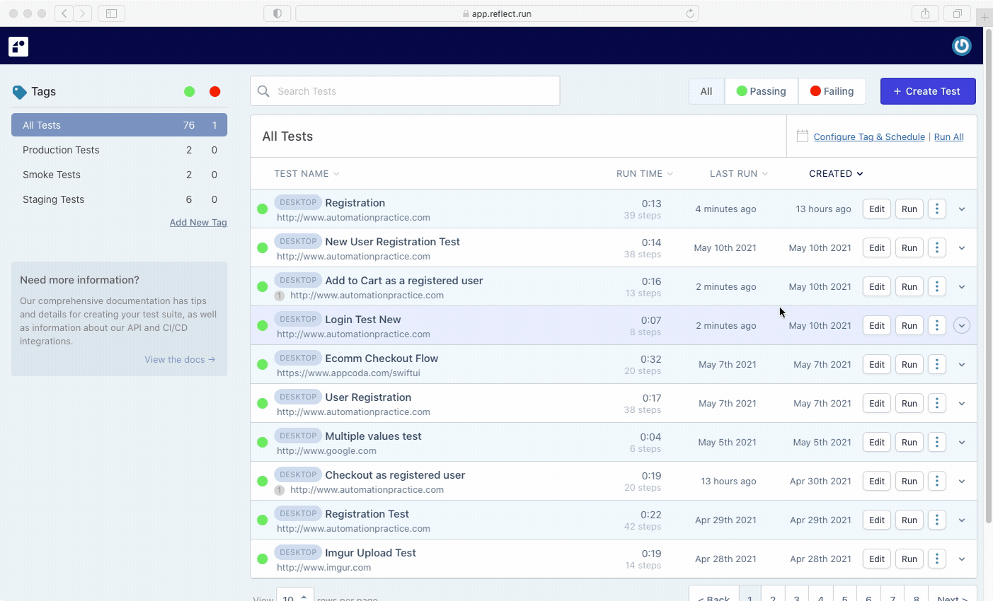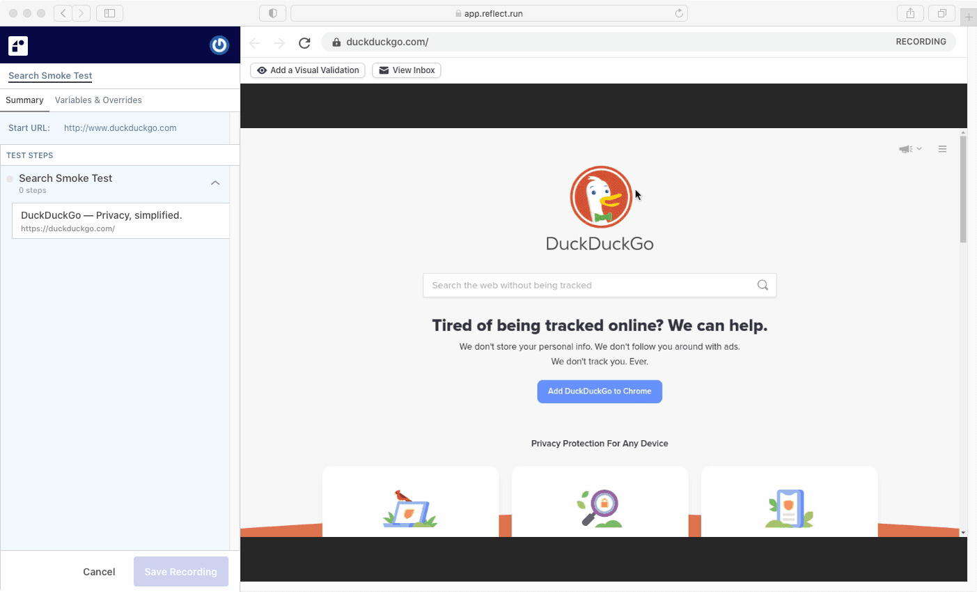Reflect is built for software organizations that want to get the benefit of automated web testing without incurring the development and support costs of code-based solutions. To create a test in Reflect, you just load up your site in our cloud-based browser, and run through your test steps like an end-user. Reflect records all of the actions you take and translates it into a repeatable test that you can run any time. With Reflect theres nothing to install, and it only takes a few minutes to create a test, versus hours (or worse) using a code-based tool. Since Reflect is a no-code tool, you'll never need to write a line of code to E2E test your web app.