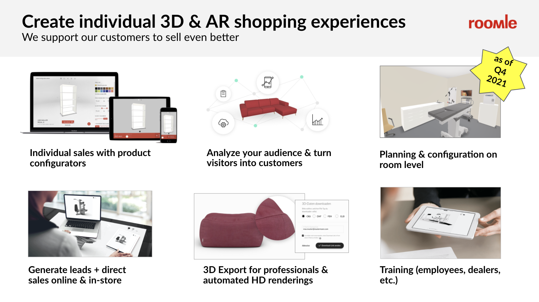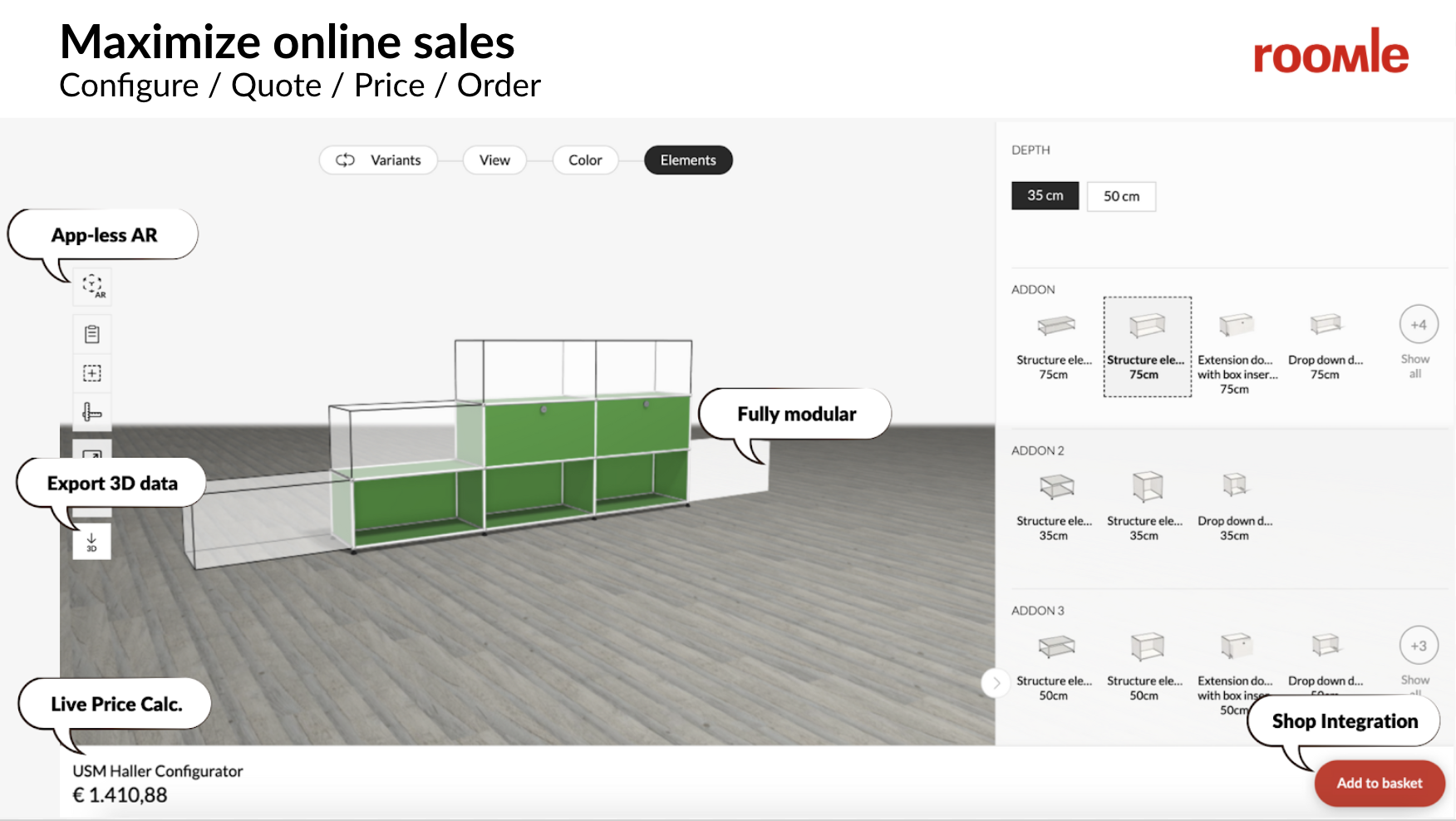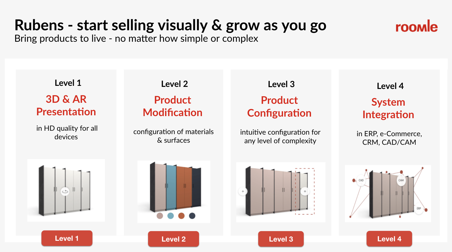 The Rubens Visual Configurator and CPQ (configure, price, quote) solution helps manufacturers, retailers and tech companies to deliver outstanding and seamless 3D/AR product configuration experiences that generate revenue ans outstanding shopping experiences for sales processes, at scale. 4 Levels of different product visualization and configuration functionality and complexity enable an easy start into digital sales for both small and large businesses. Ready for all systems, platforms and devices.