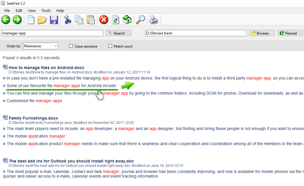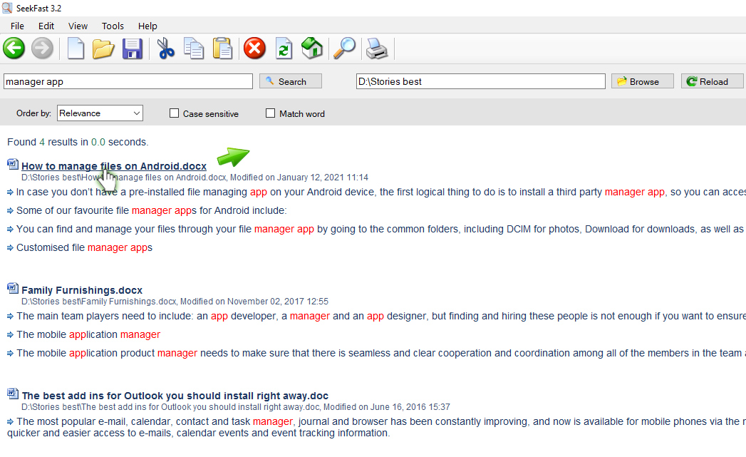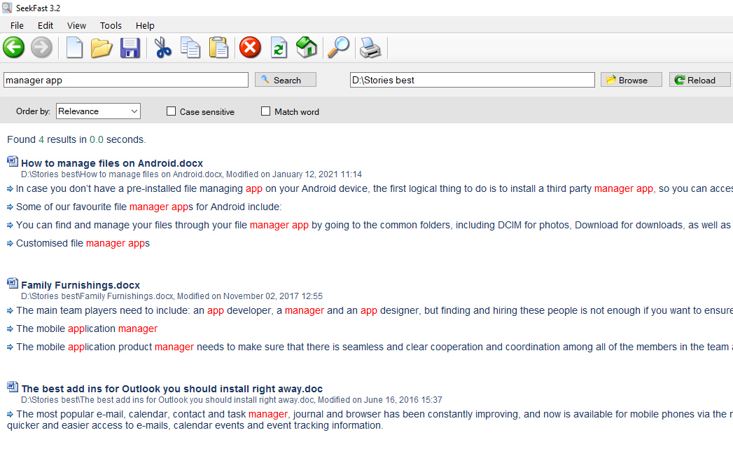 SeekFast is a software tool, allowing you to quickly and easily search text in files on your computer. It supports all common document file types: Microsoft Word Documents (DOCX, DOC) PDF files (PDF) Microsoft Excel Spreadsheets (XLSX, XLS) Microsoft PowerPoint files (PPTX, PPT) OpenOffice Document Text (ODT) LibreOffice Writer documents (ODT) LaTeX documents (TEX) Rich Text Format (RTF) Text files (TXT, HTML, XML, PHP, CPP, CS, JAVA, PL, PY, JS and others) You choose which types of files and in which folder (and its subfolders) you want to search on your computer. SeekFast is available for Windows and Mac operating systems.