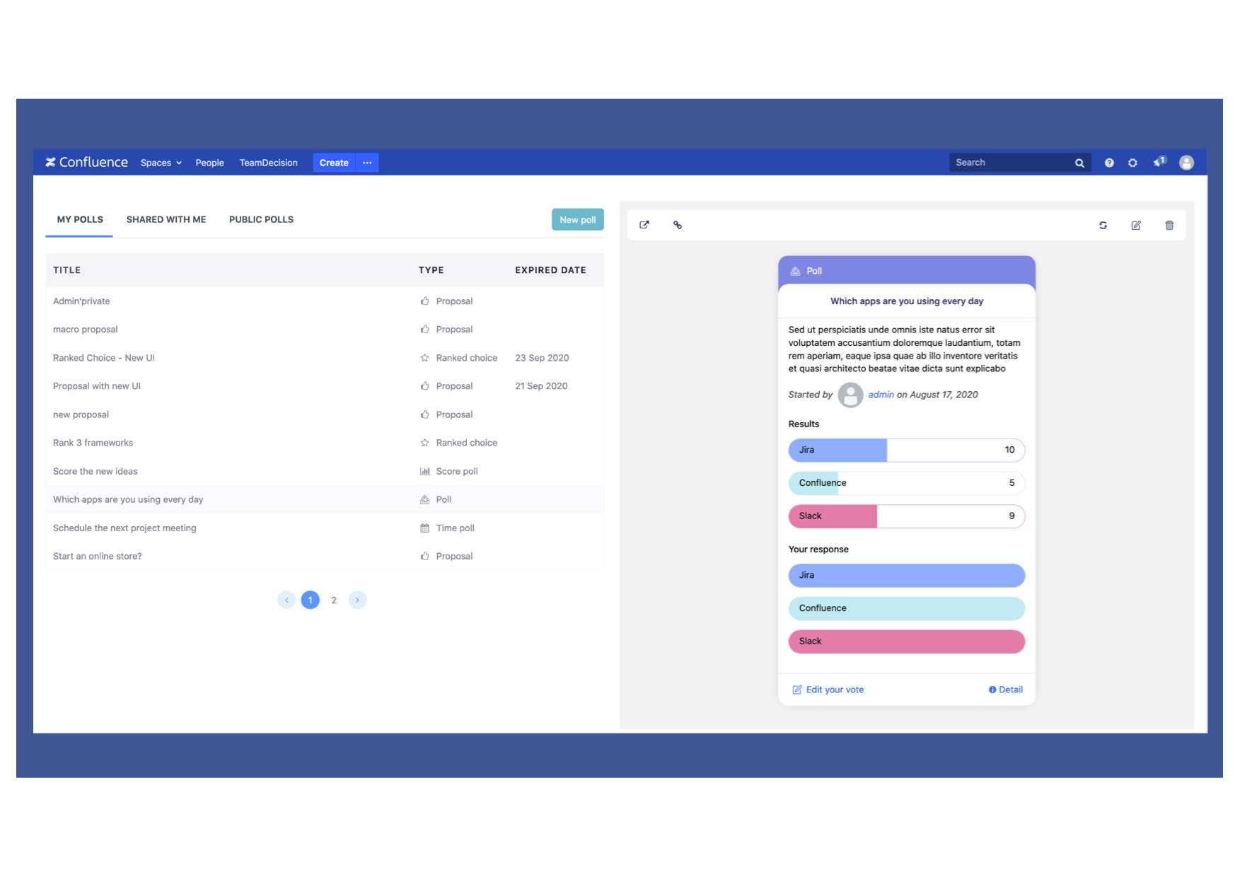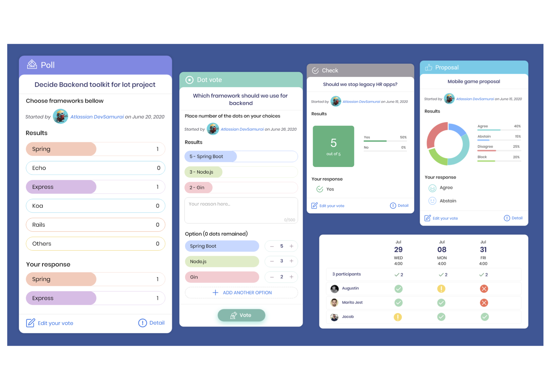 Stop spamming others and yourself with multiple emails or spending hours of meetings when there is something need to decide. Team Decision is a Confluence Cloud Plugin enables Confluence users to have discussions and make decisions together in Confluence page. You can create various types of decision such as proposals, polls, checks, votes, choices and gather responses from your team in Confluence, no need to move to other apps like Doodle. Confluence Team Decision supports following poll types Proposal Check Poll Dot Vote Score Poll Time Poll Ranked Choice