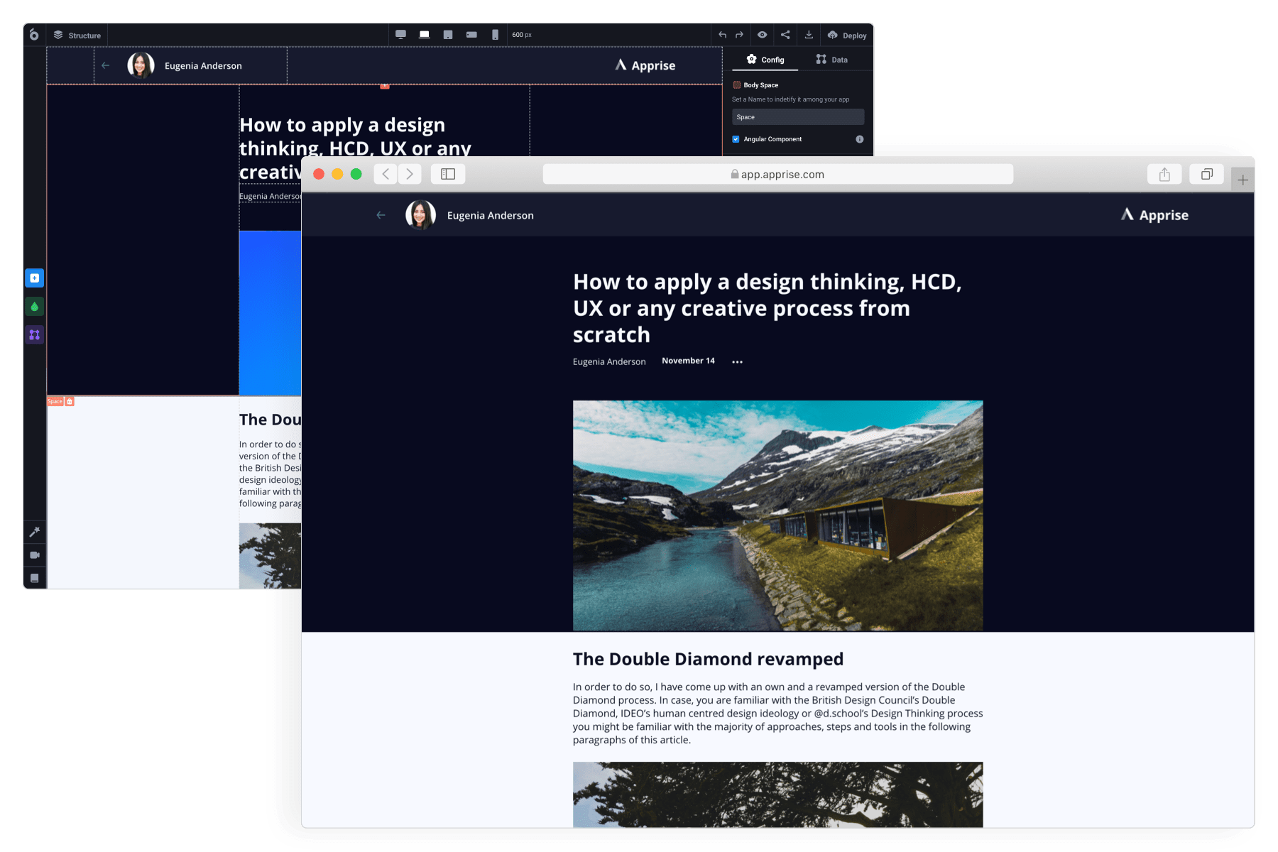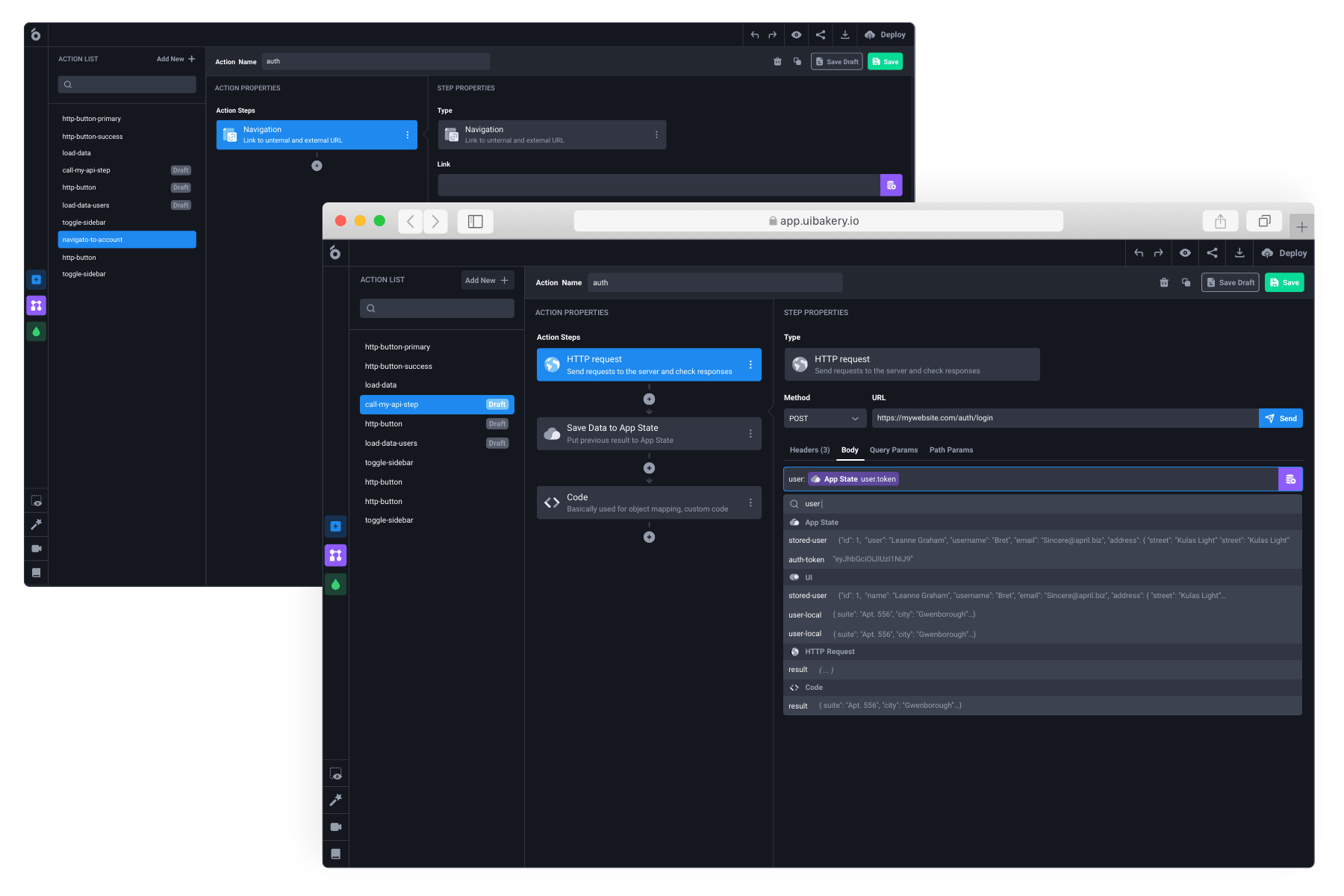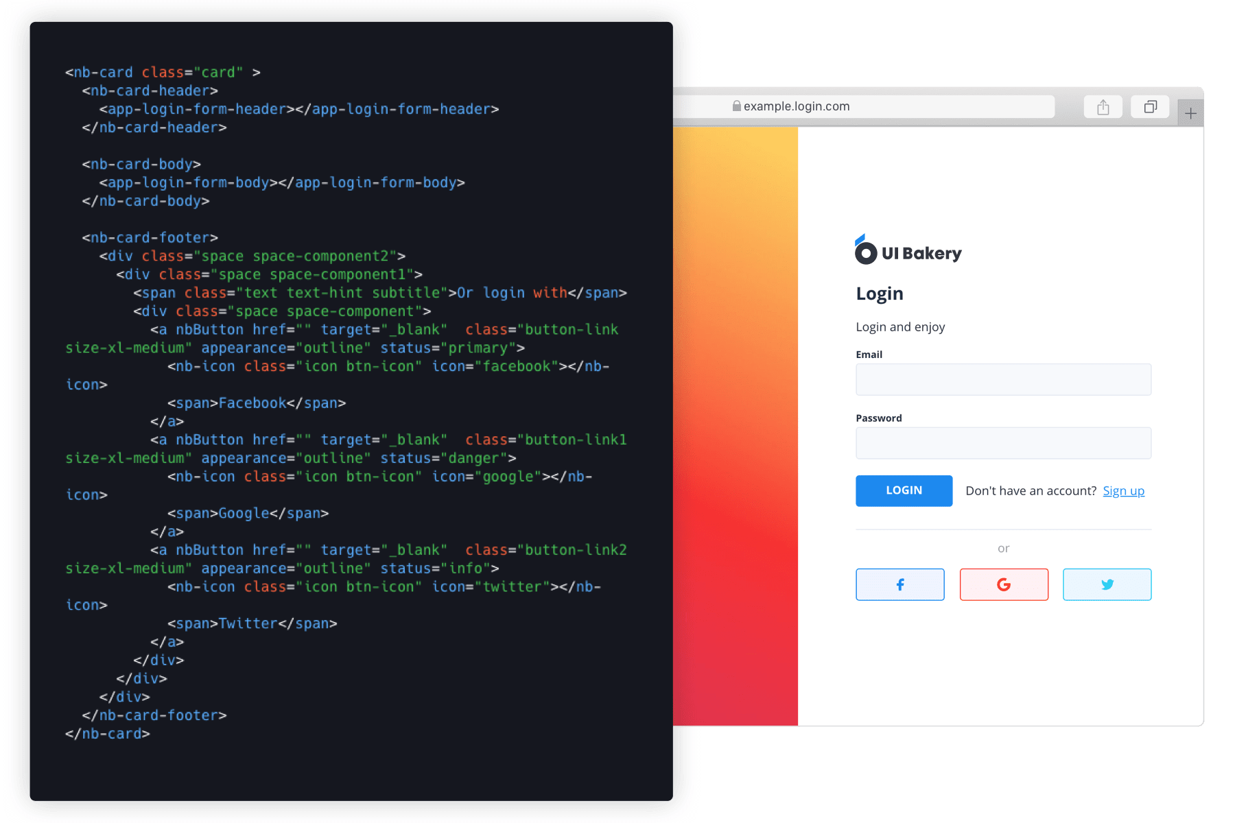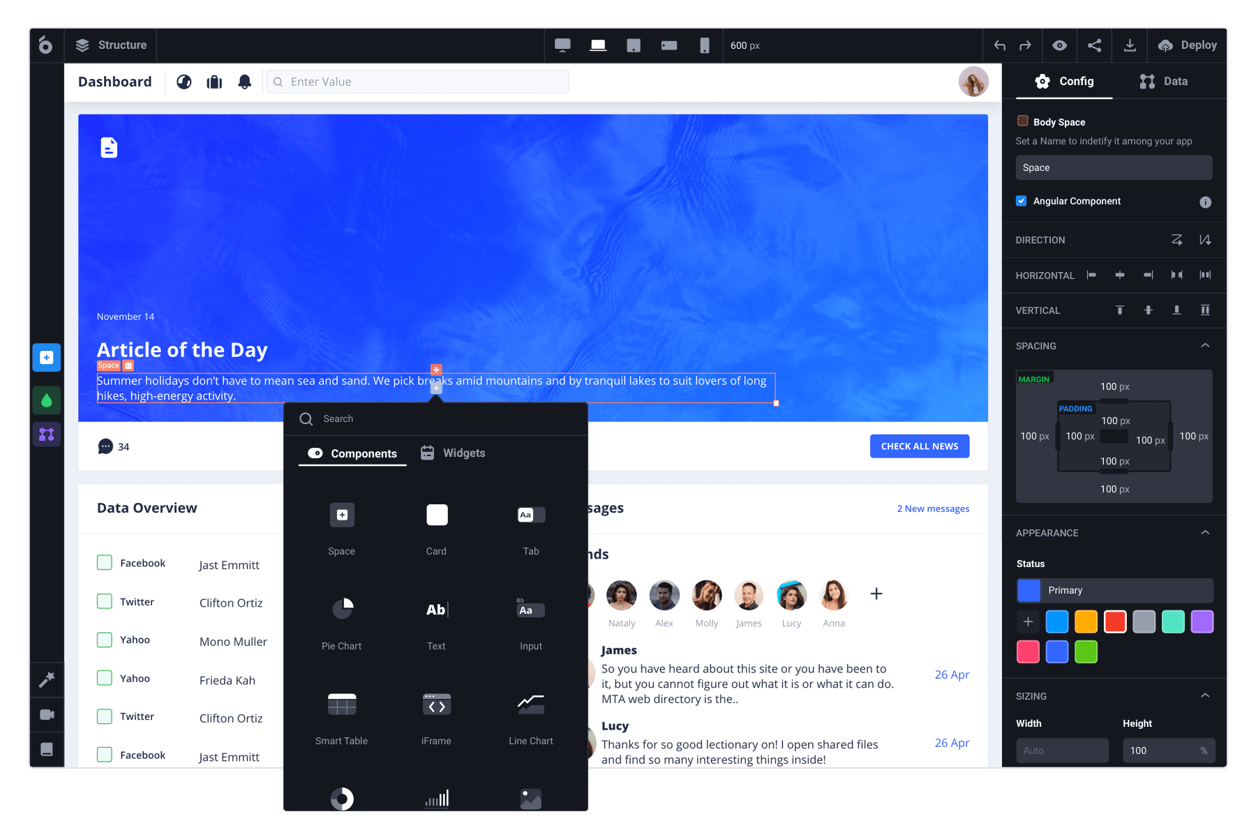 UI Bakery is a low-code platform that allows in a visual way to prototype a responsive front-end of the app and connect it to a custom backend right in UI Bakery.UI Bakery handles UI development while you create a business-logic of your next web application. A user can also change the visual style of the app so that it complies with the company branding colors. It bases on a customizable Eva Design System and Nebular – Angular Open Source UI Kit. UI Bakery generates a zip file with a regular Angular project.