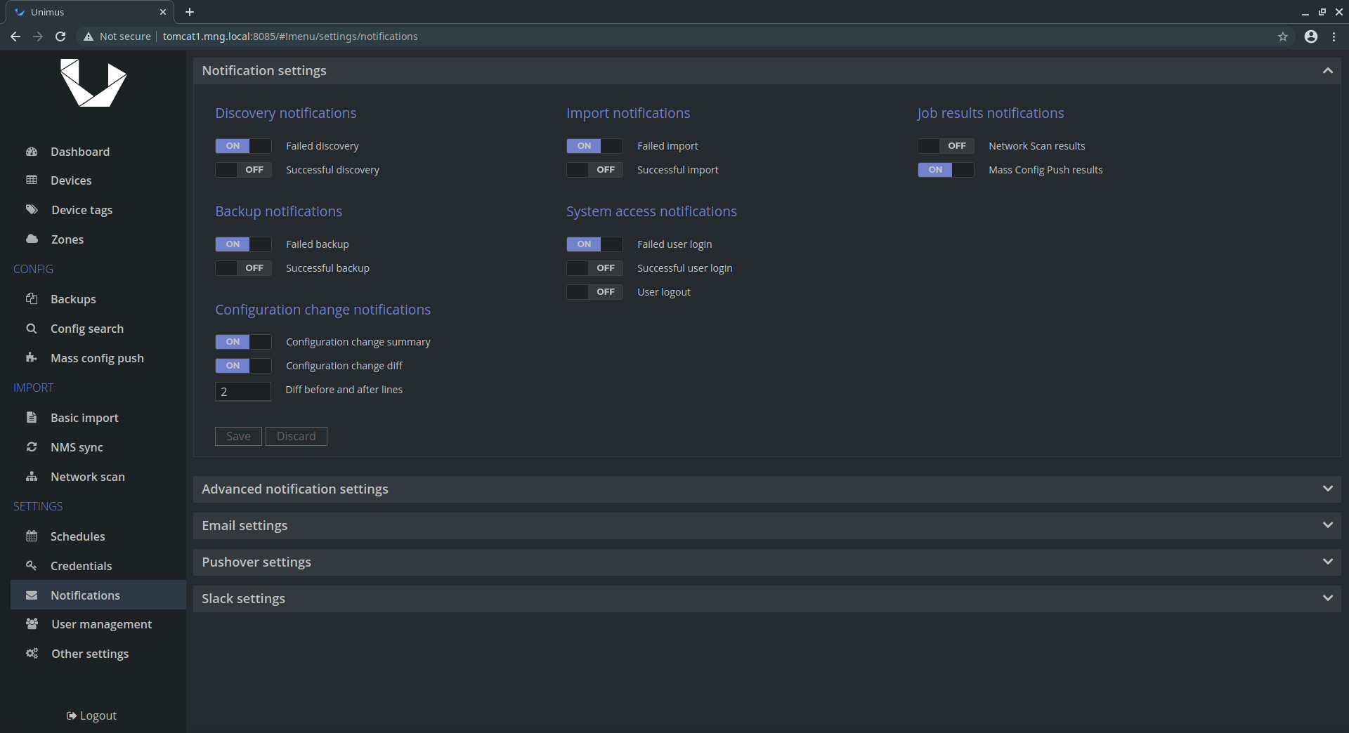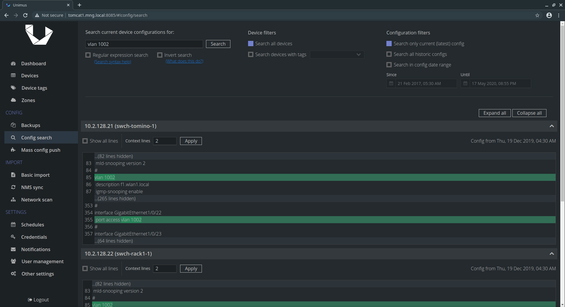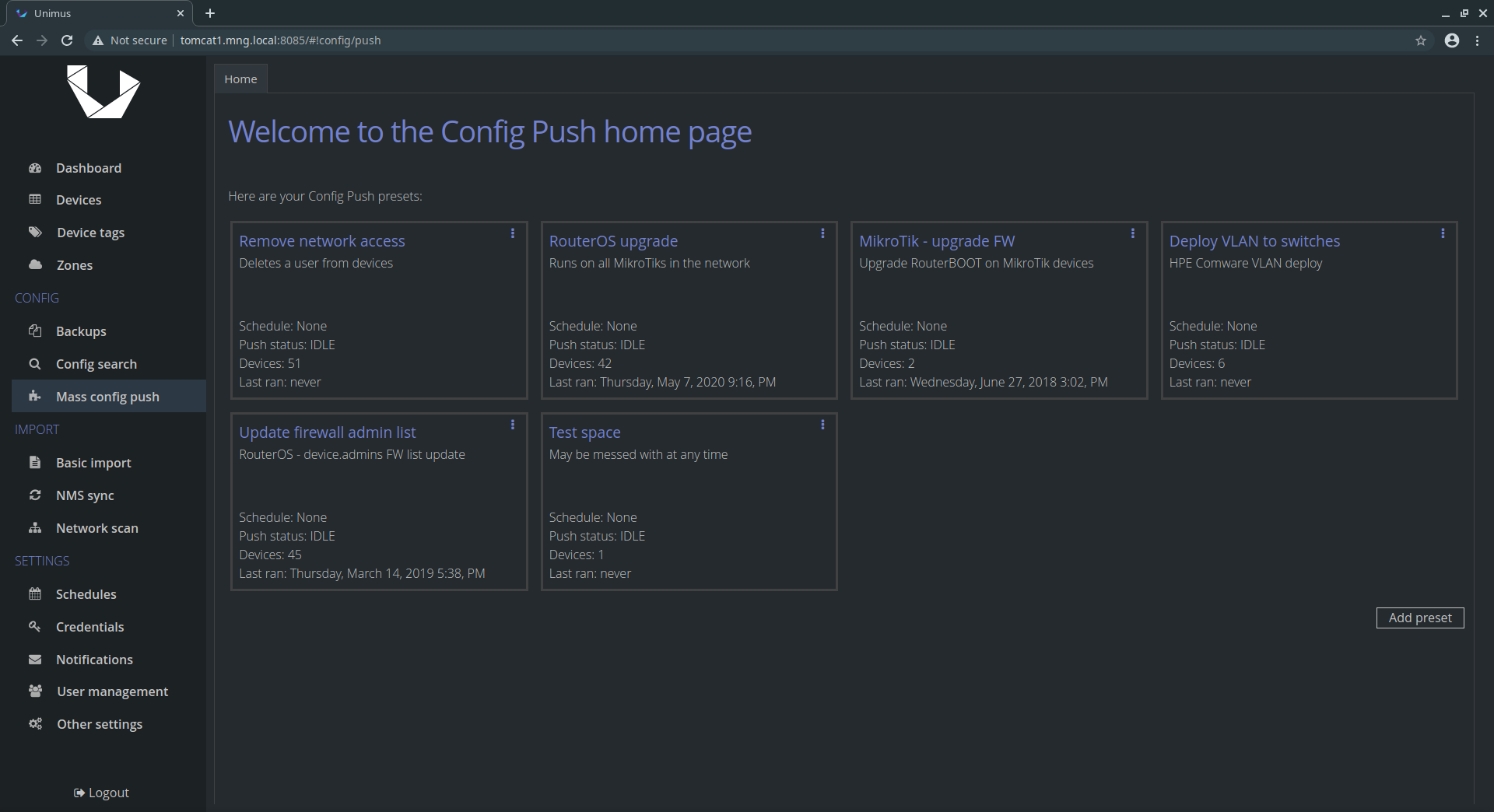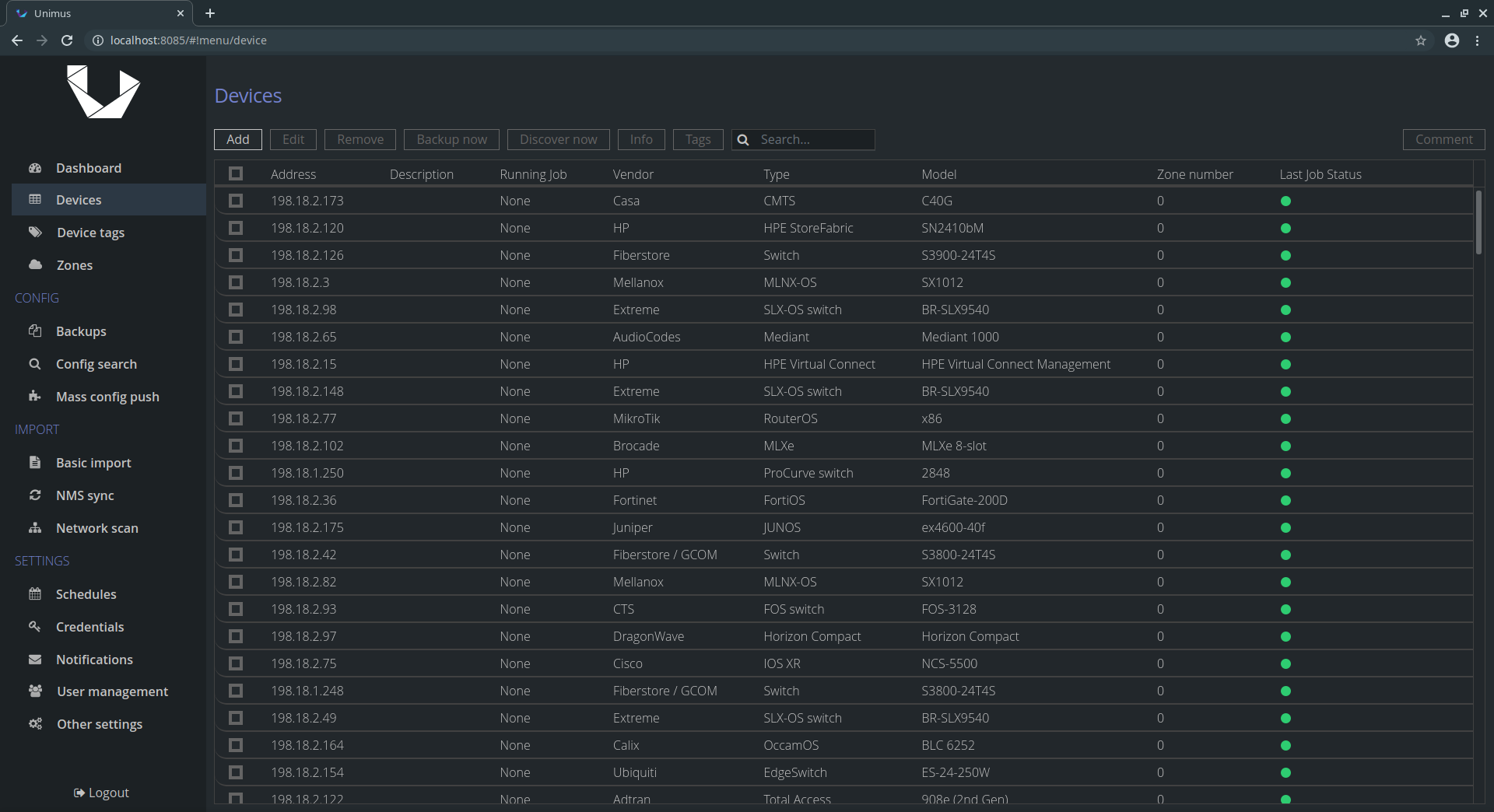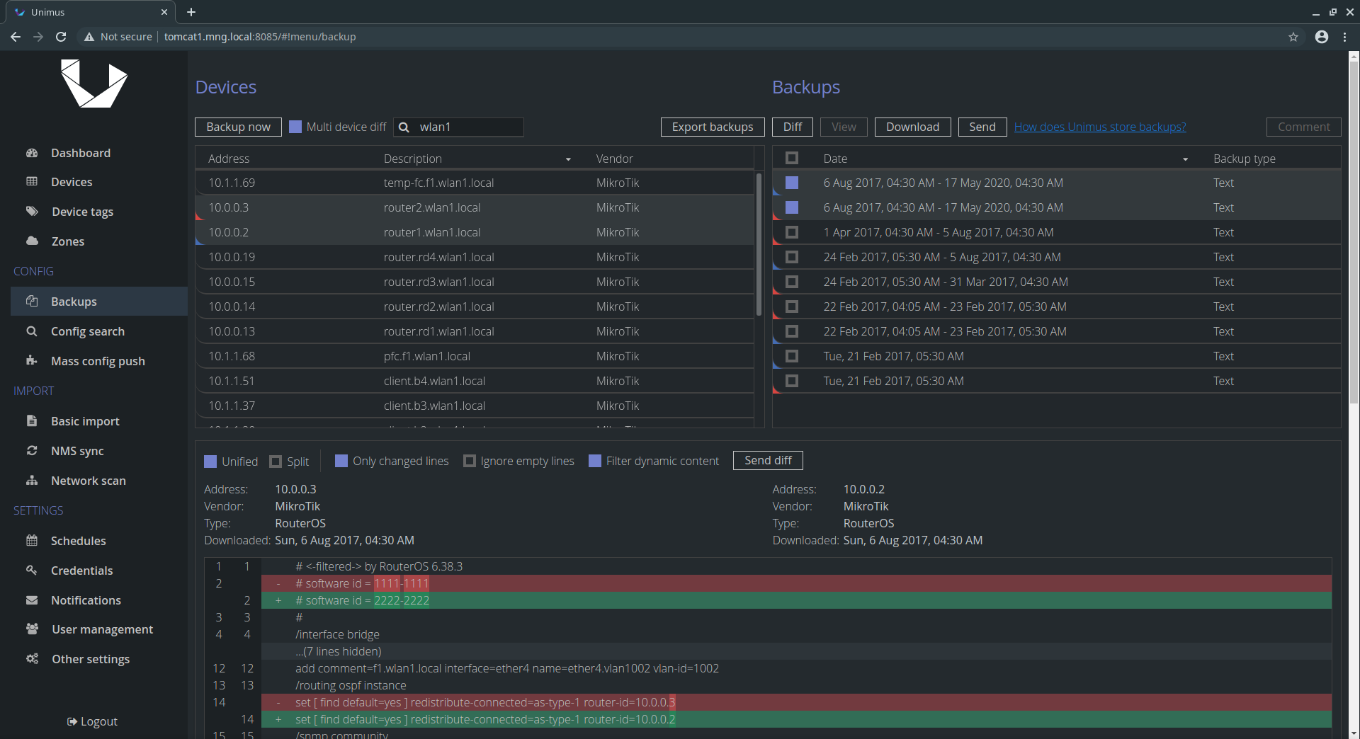 Unimus helps in four main areas of network management: #1 Network Automation Mass Config Push / Pull makes network automation painless. #2 Disaster Recovery Configuration backup and network disaster recovery. #3 Change Management Configuration change detection, notifications and change review / auditing. #4 Configuration Auditing Network-wide configuration search for easy compliance validation. Unimus is extremely easy to deploy and use, and provides a wide feature-set that will help you run your network.