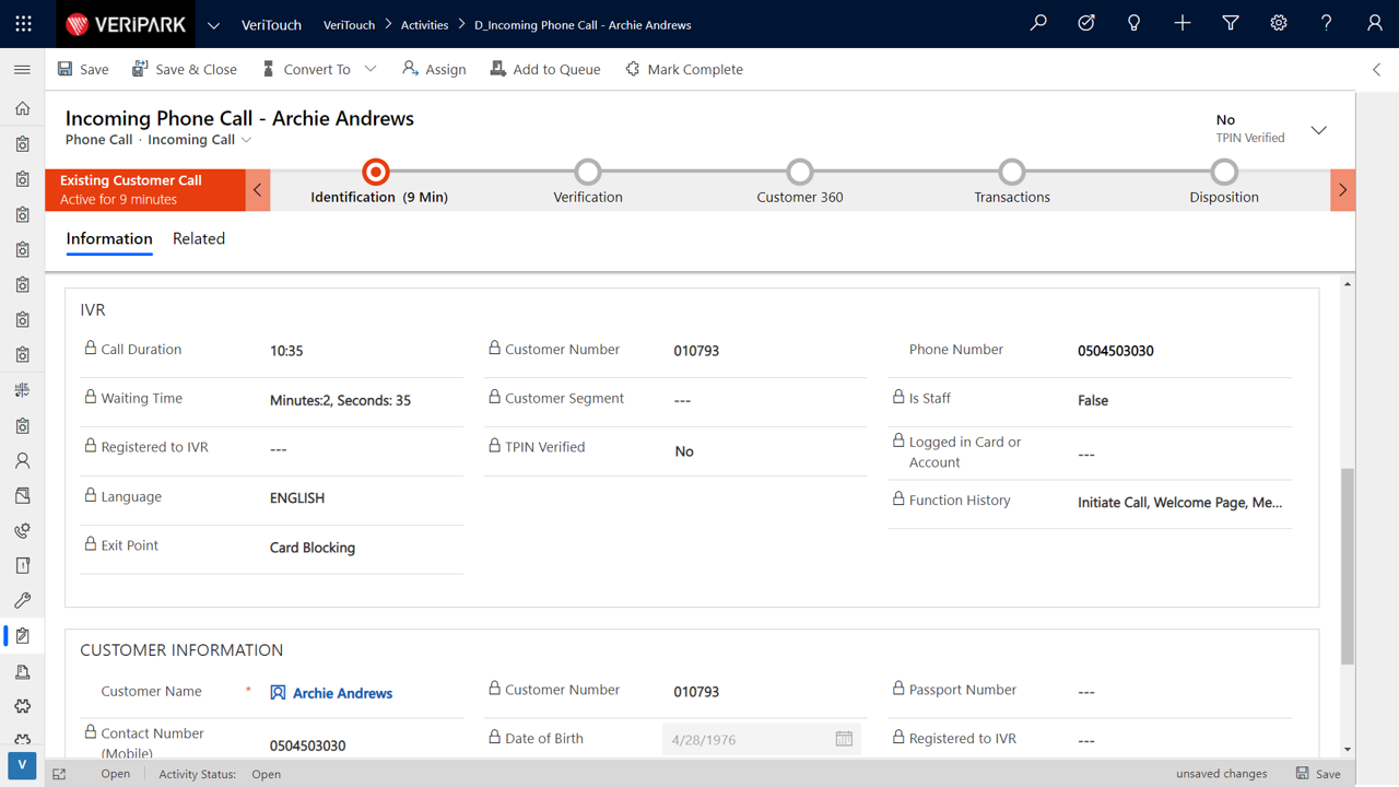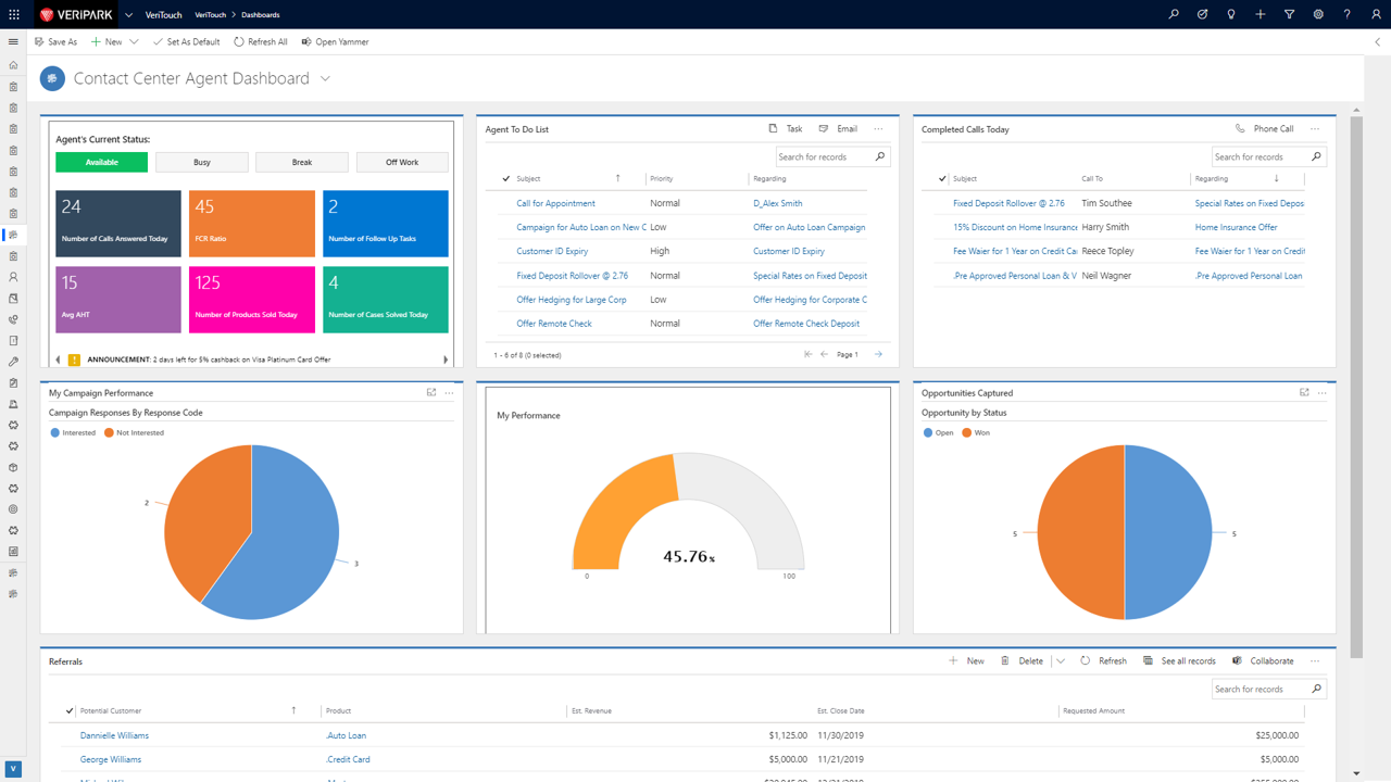 VeriTouch Customer Engagement (CRM) VeriTouch is a vertical solution built on top of Dynamics 365, optimized with industry best practices that enable banks and insurance companies to place customer relationship management at the core of their digital transformation journey. VeriTouch consolidates data from the organization's back-end systems and digital channels. It provides a unified front end with standardized processes to serve customers efficiently; streamlined and tailored solutions to solve customers' concerns and address their needs; recommendations and guided selling tools to deliver relevant and differentiated offers to customers.
